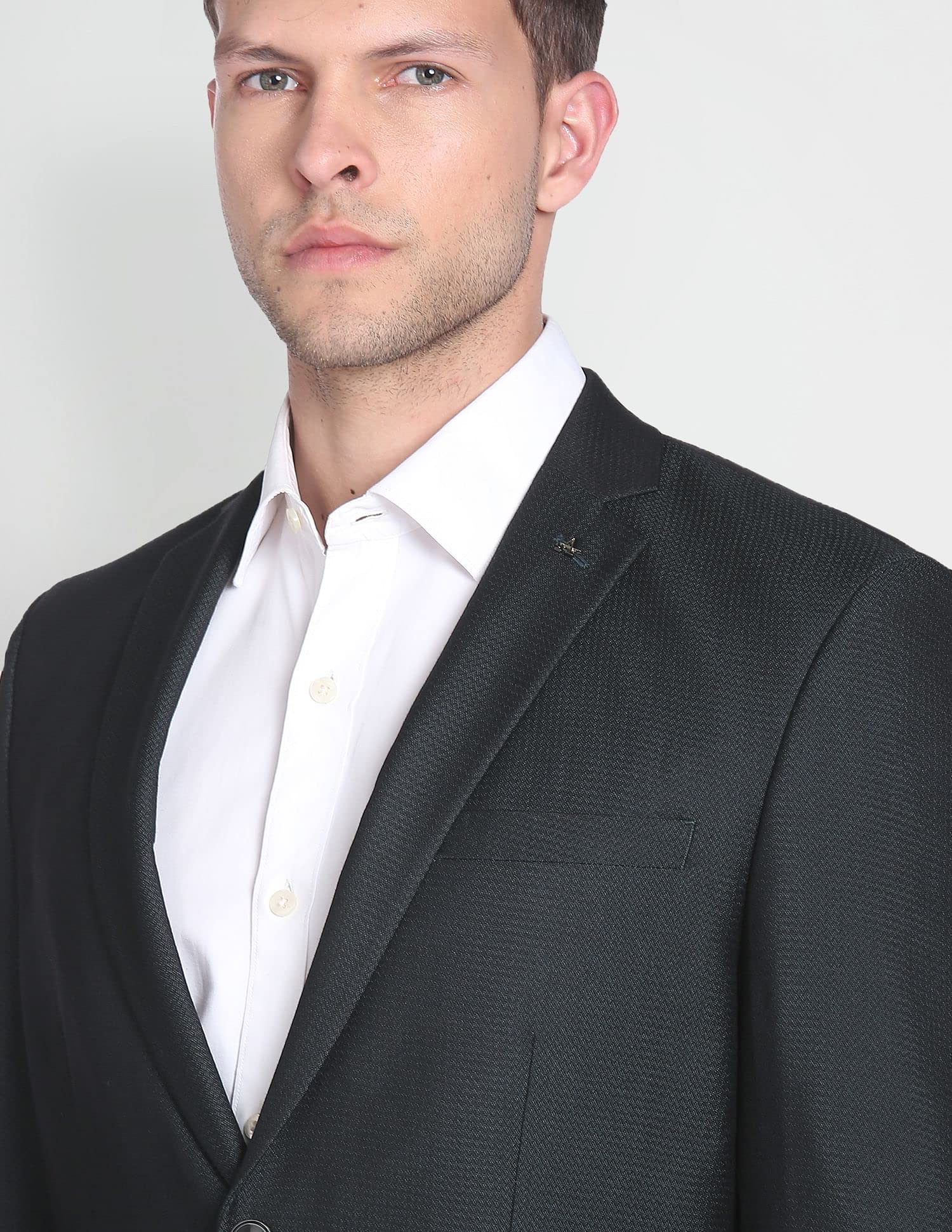 - Notch lapel collar with metallic brand pin