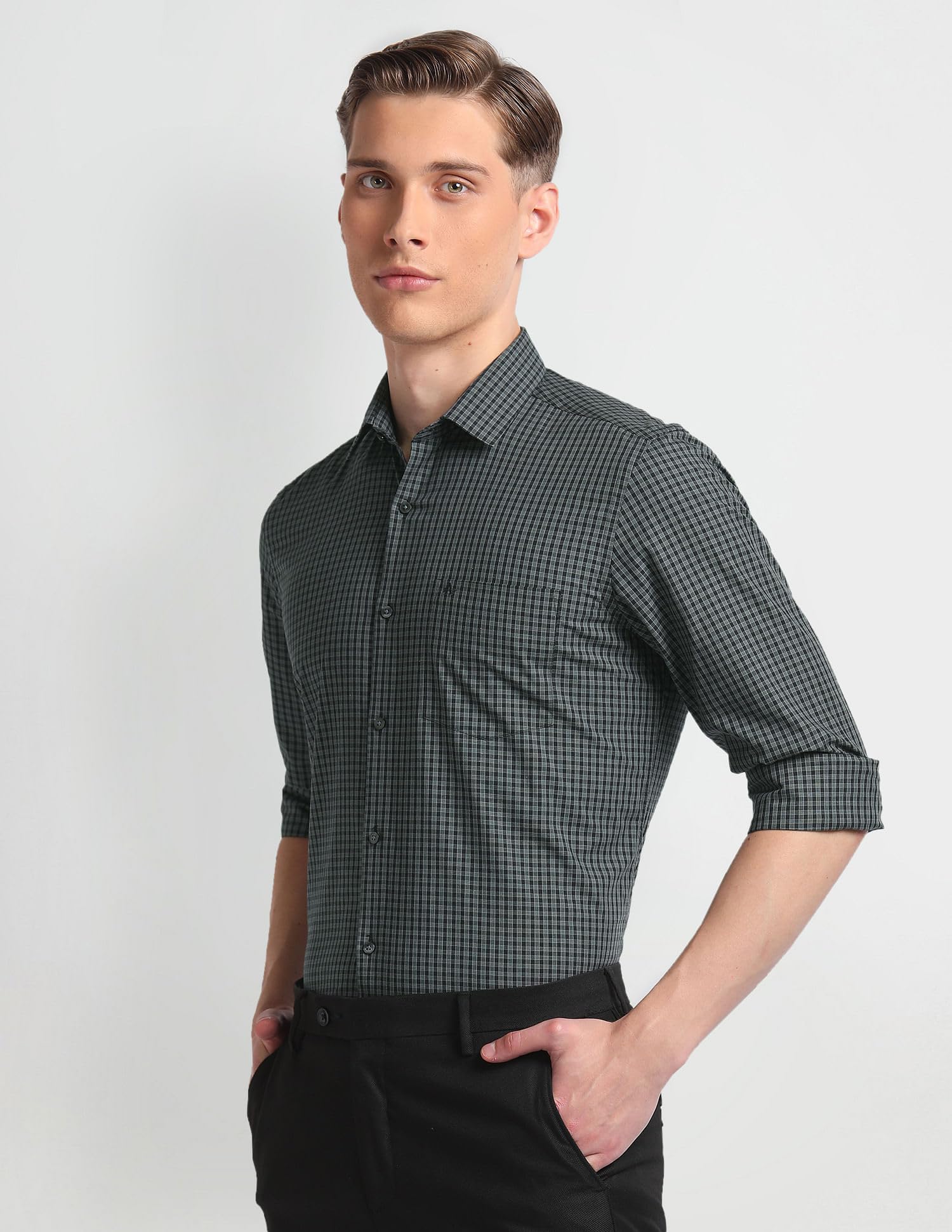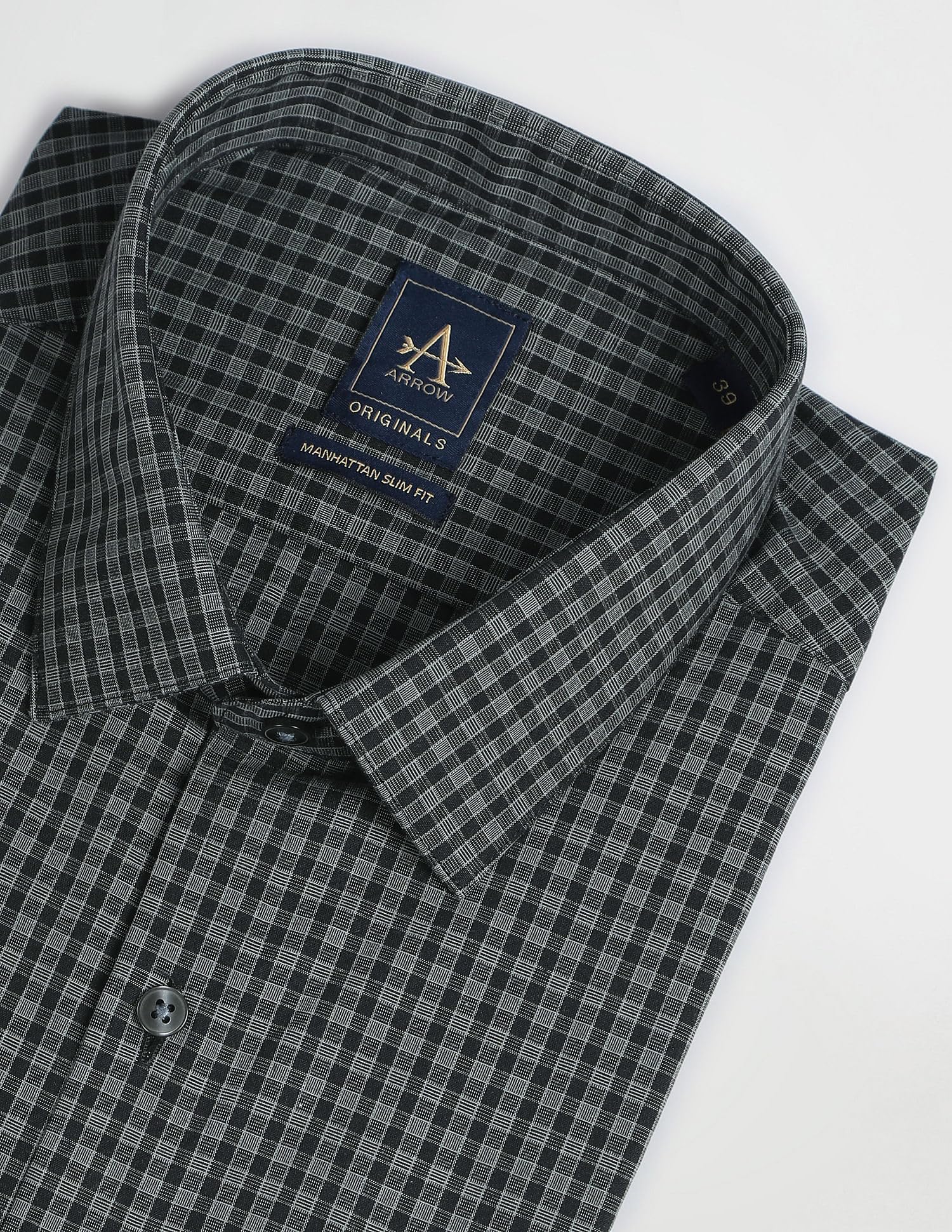 Arrow Men's Grey Checked - Cutaway Collar Full Sleeves Formal Shirt with Chest Pocket | Cotton Fabric | Slim Fit