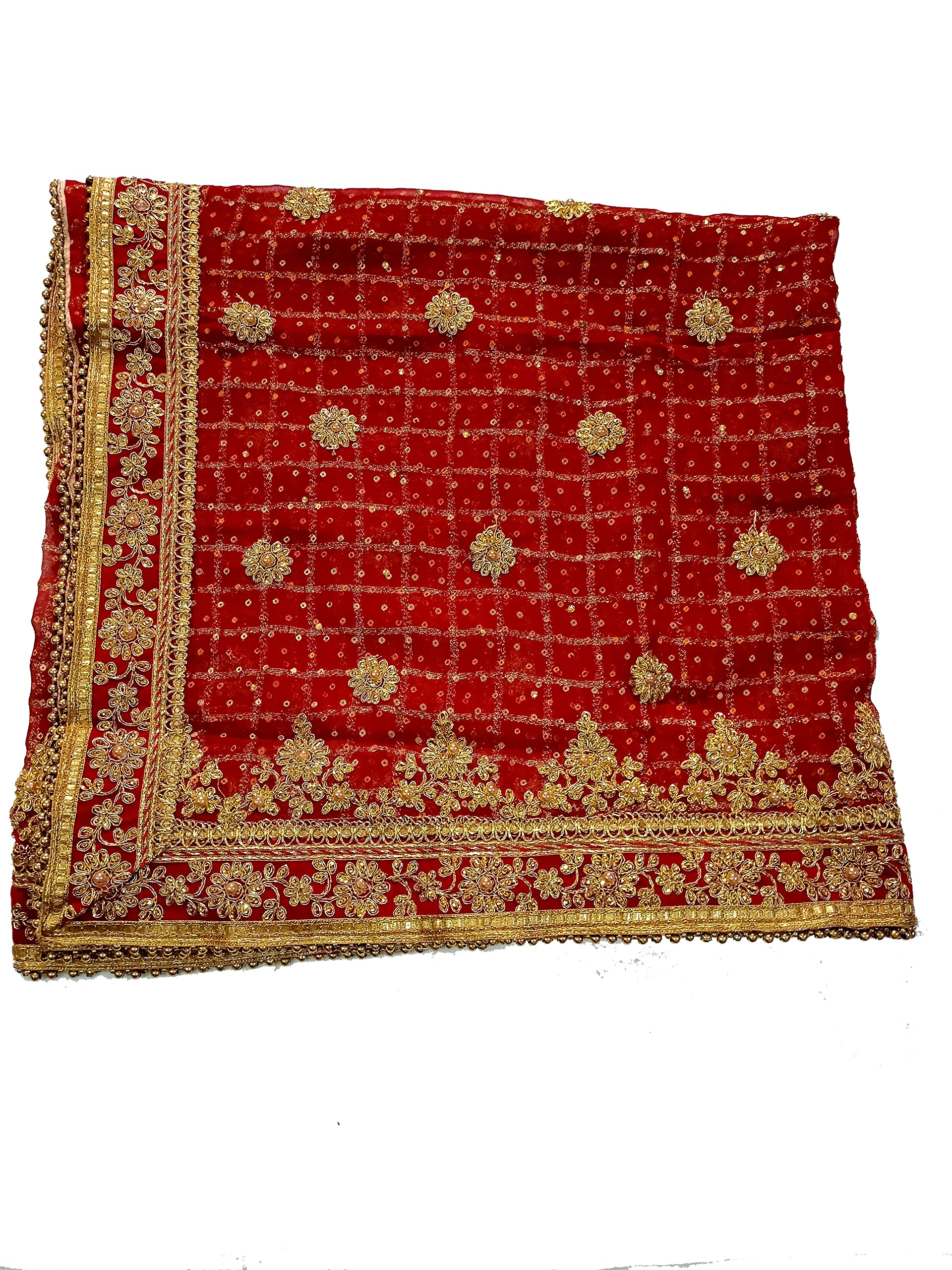 RED BANDHANI DUPATTA WITH VELVET BORDER AND ALL SIDES MOTI SPECIALLY USED IN WEDDINGS AND NIKAH , IT CAN BE ALSO USED FOR CHANYA CHOLI DUPATTA AND FOR MATA KI CHUNRI