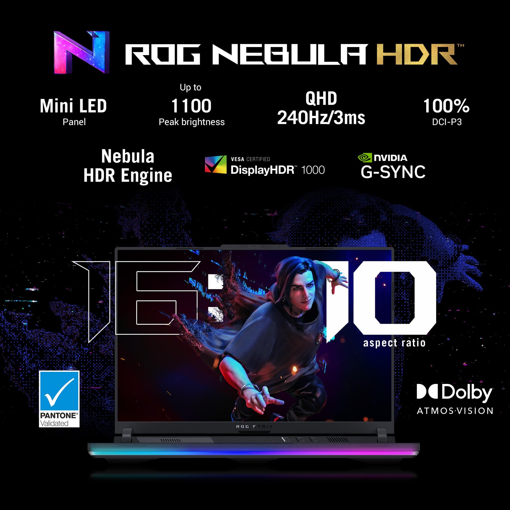 - Display: 16-inch QHD+ 16:10 (2560 x 1600, WQXGA), 240Hz Mini-LED Anti-glare display, ROG Nebula HDR Display, 1100nits 100000:1, 100% DCI-P3 %, Pantone Validated