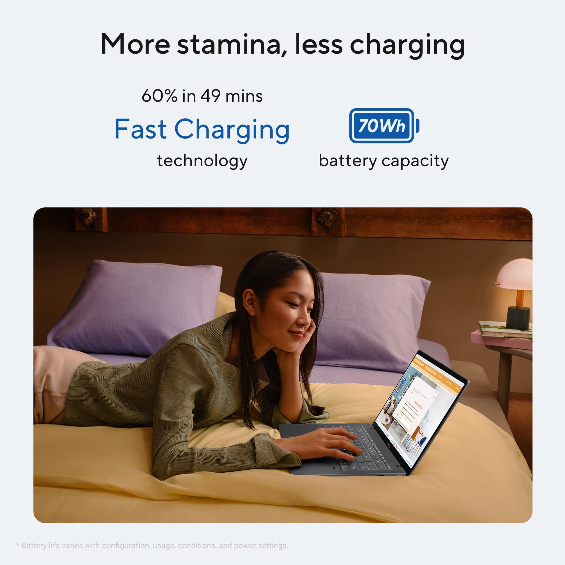 - Battery : 70WHrs, 4S1P, 4-cell Li-ion| Power : TYPE-C, 65W AC Adapter, Output: 20V DC, 3.25A, 65W, Input: 100-240V AC 50/60GHz universal