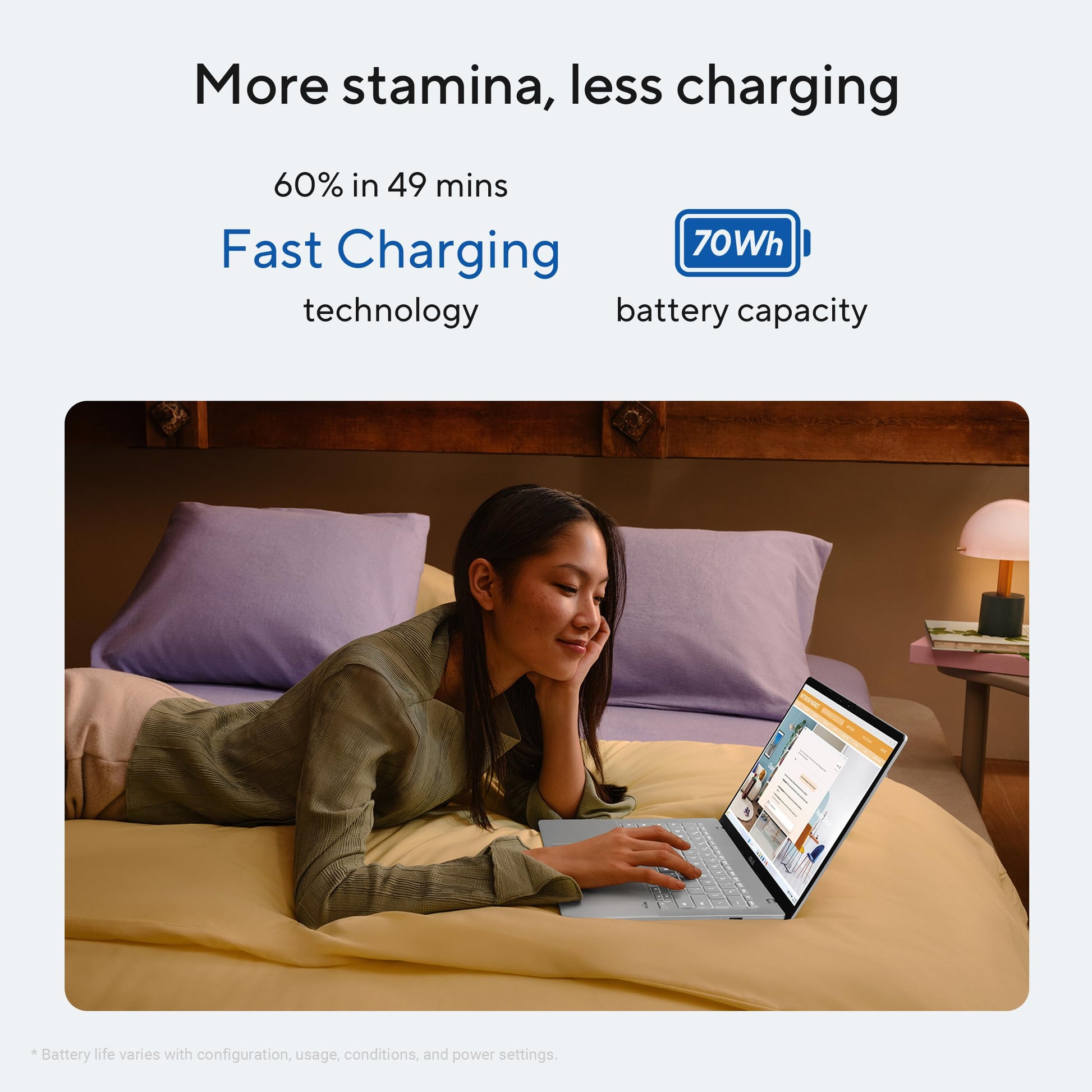 - Battery : 70WHrs, 4S1P, 4-cell Li-ion| Power : TYPE-C, 65W AC Adapter, Output: 20V DC, 3.25A, 65W, Input: 100-240V AC 50/60GHz universal