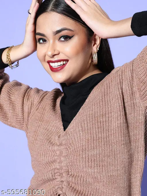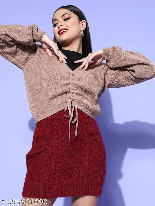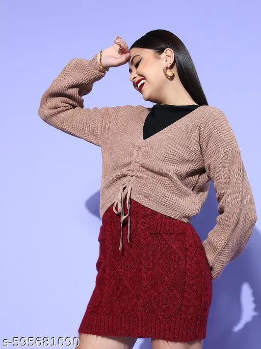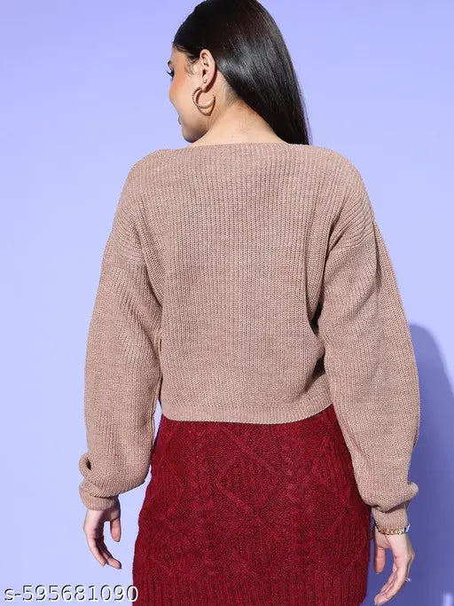 NameBerrylush Women Solid Peach V-Neck Front Tie-Up Acrylic Straight Hem Cropped Sweater
