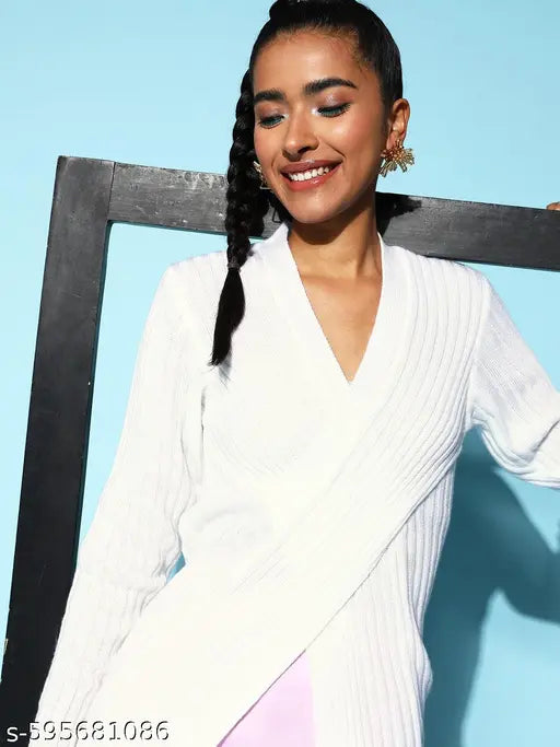 NameBerrylush Women Solid White V-Neck Acrylic Ribbed Hem Regular Sweater