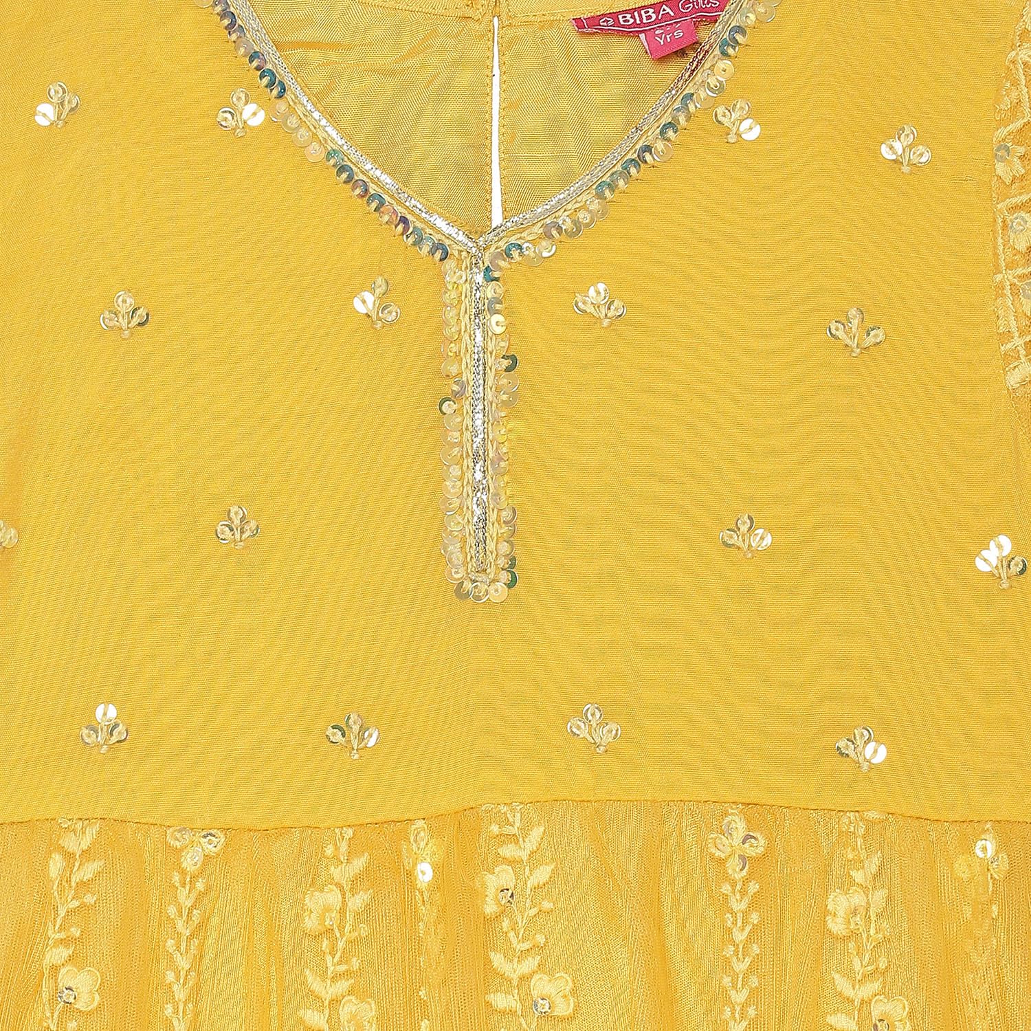 BIBA Girl Polyester Blend Embroidery Gathered Kid Salwar Suit Set (Kw5367_Yellow_15)
