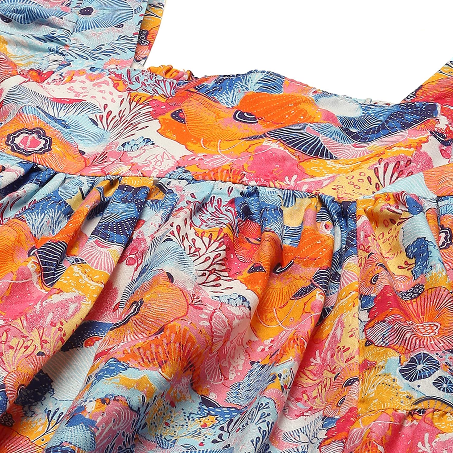 Introduce your little girl to the Biba Girl's Blue Printed Cotton Gathered Dress, a stylish and comfortable dress that she'll love. This dress has a gathered fit, ruffle sleeves and square neckline, adding a touch of feminine charm to her outfit. The dress is made with soft and breathable cotton, making it perfect for warm weather. The dress has a fun bold aquatic print all over, adding a touch of fun and personality to her outfit. The blue color makes it perfect for any occasion, dressy or casual. It will be a versatile addition to her wardrobe. Upgrade her wardrobe with this must-have piece.