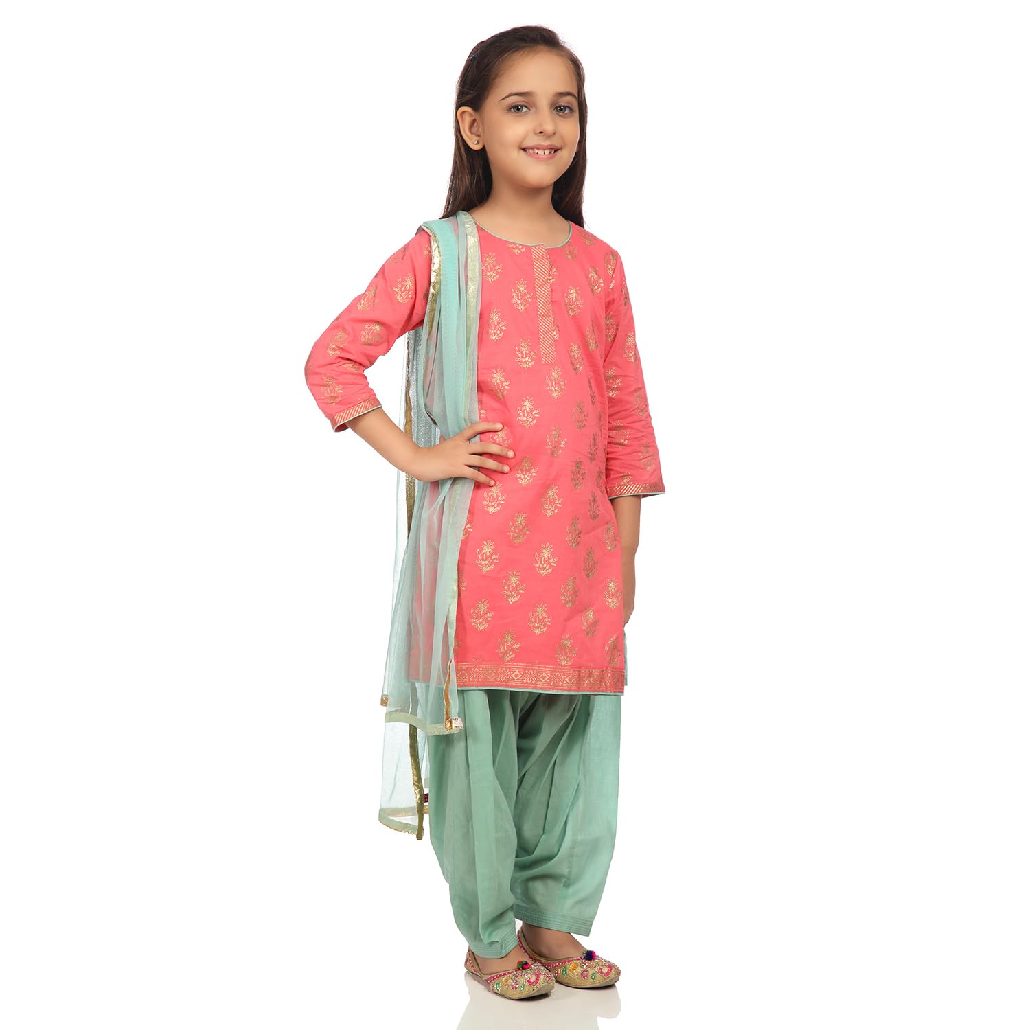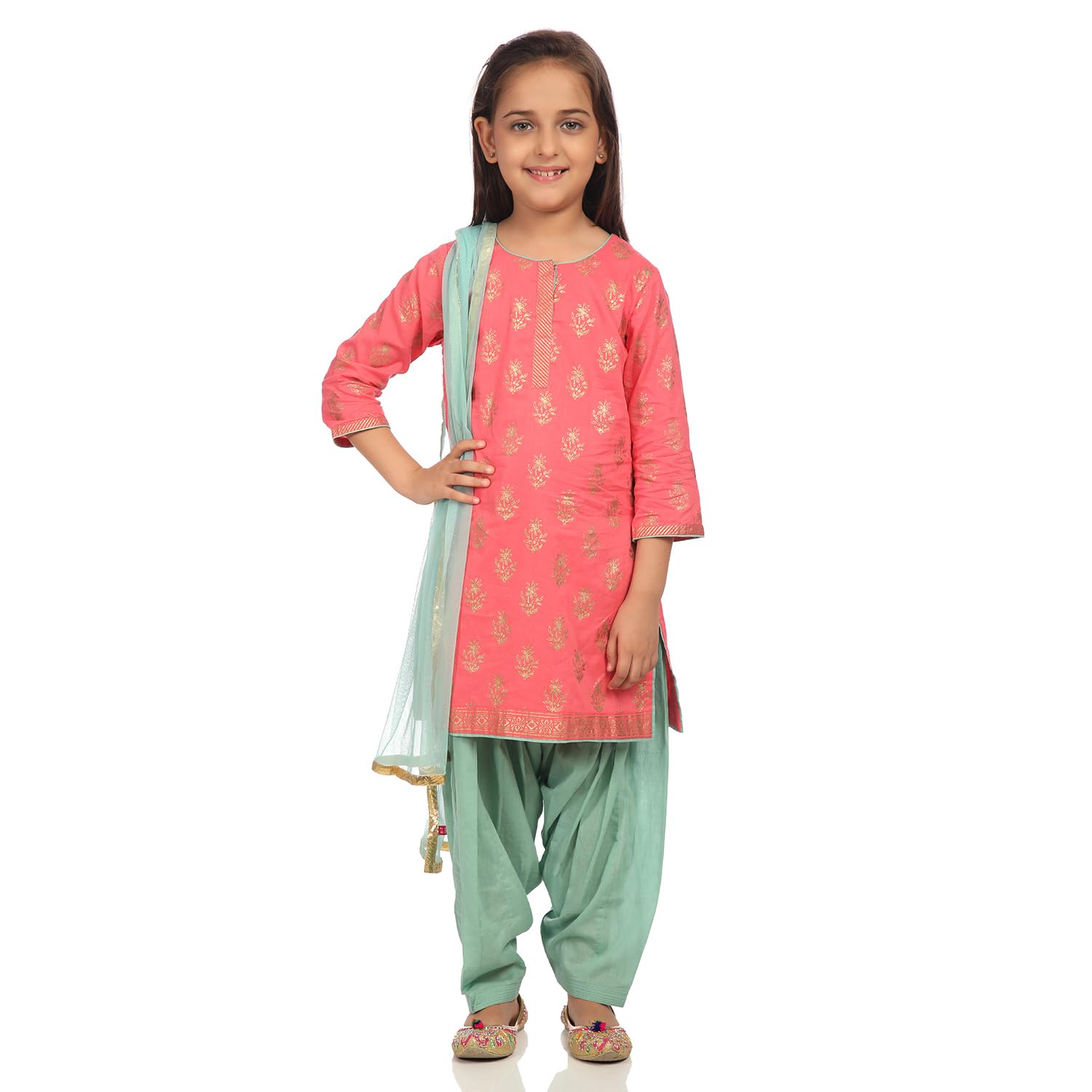This beautiful suit-set with interesting print is just what you want for your little girl. The set includes one beautiful metallic kurta with straight hem and three-forth sleeves, paired with Patiala salwar and dupatta.
