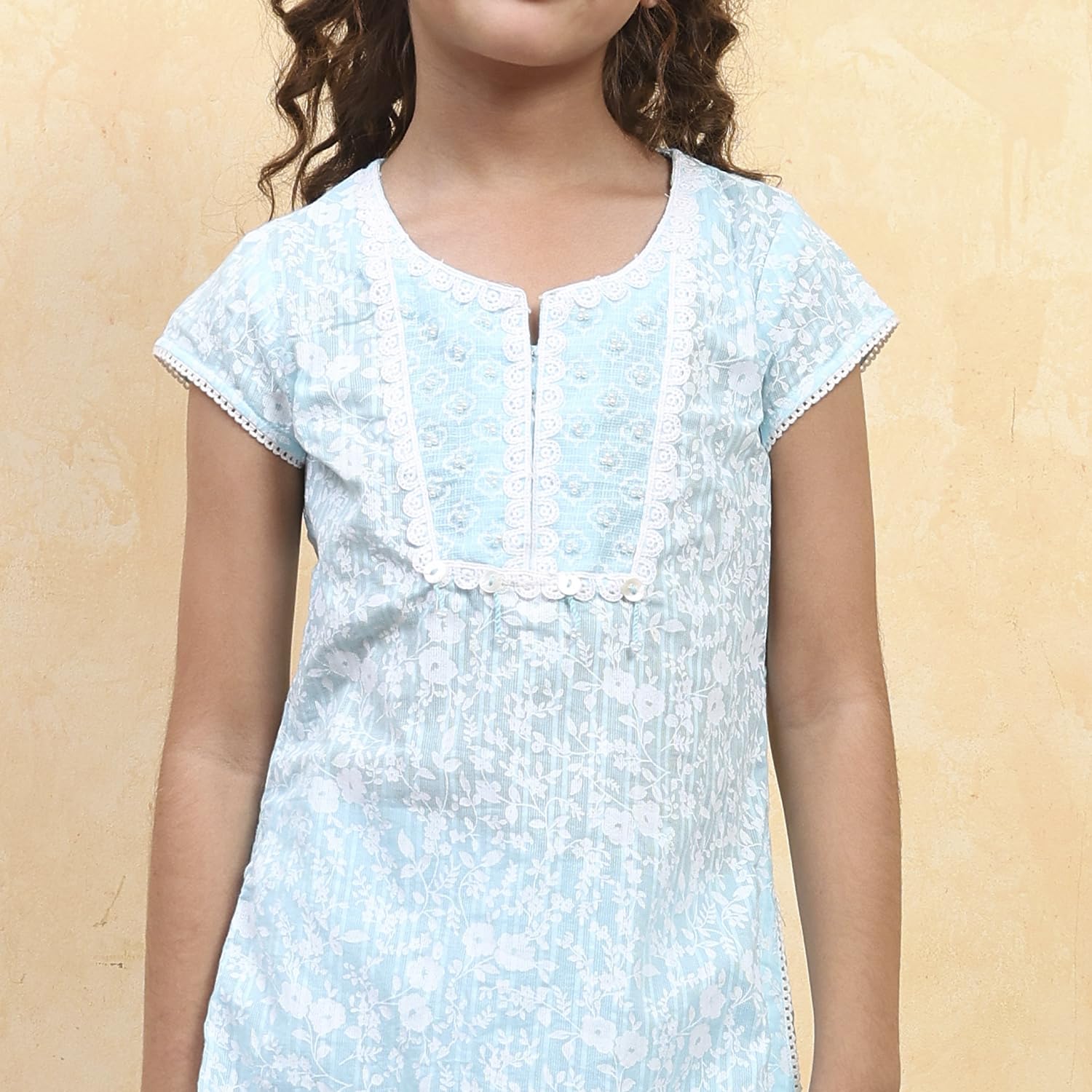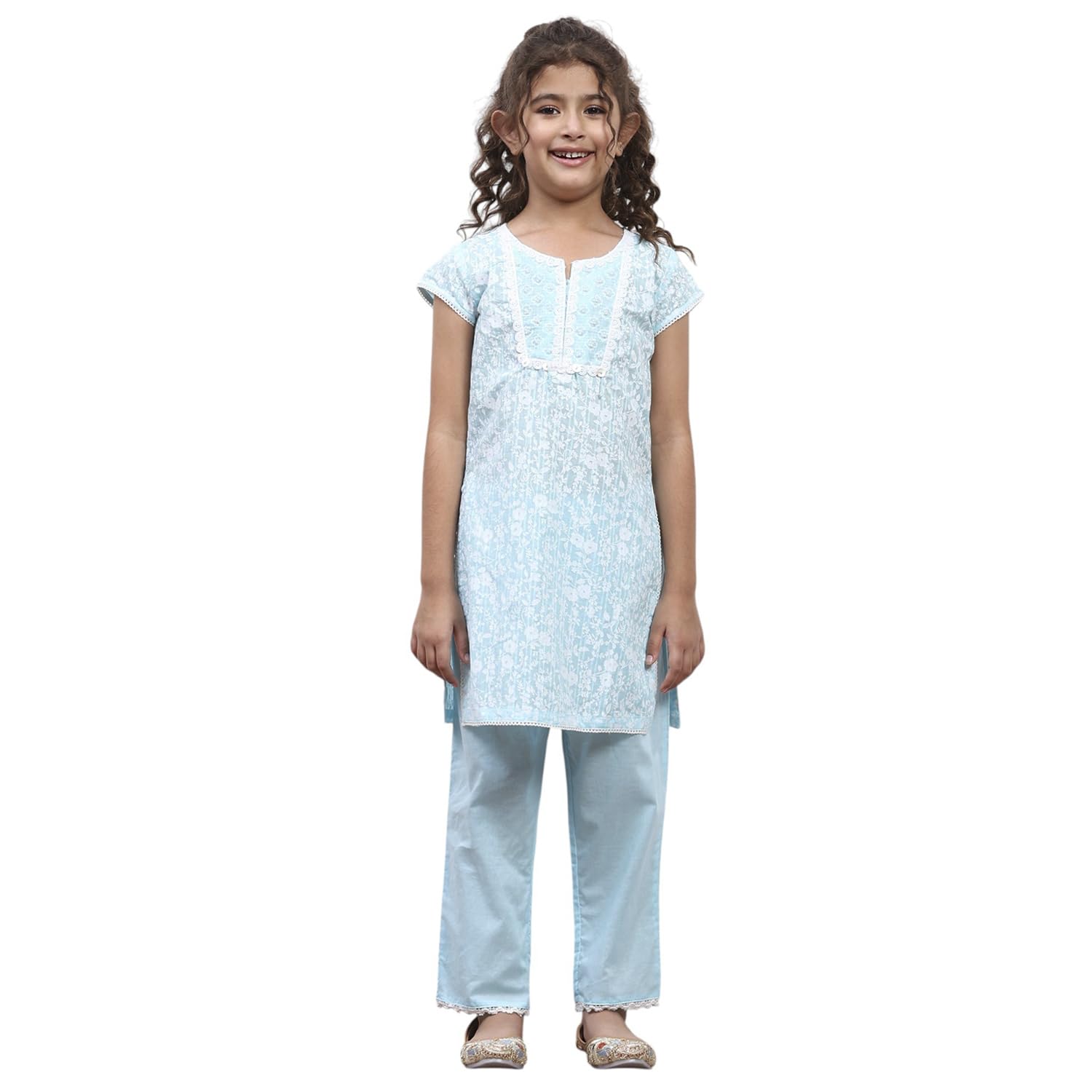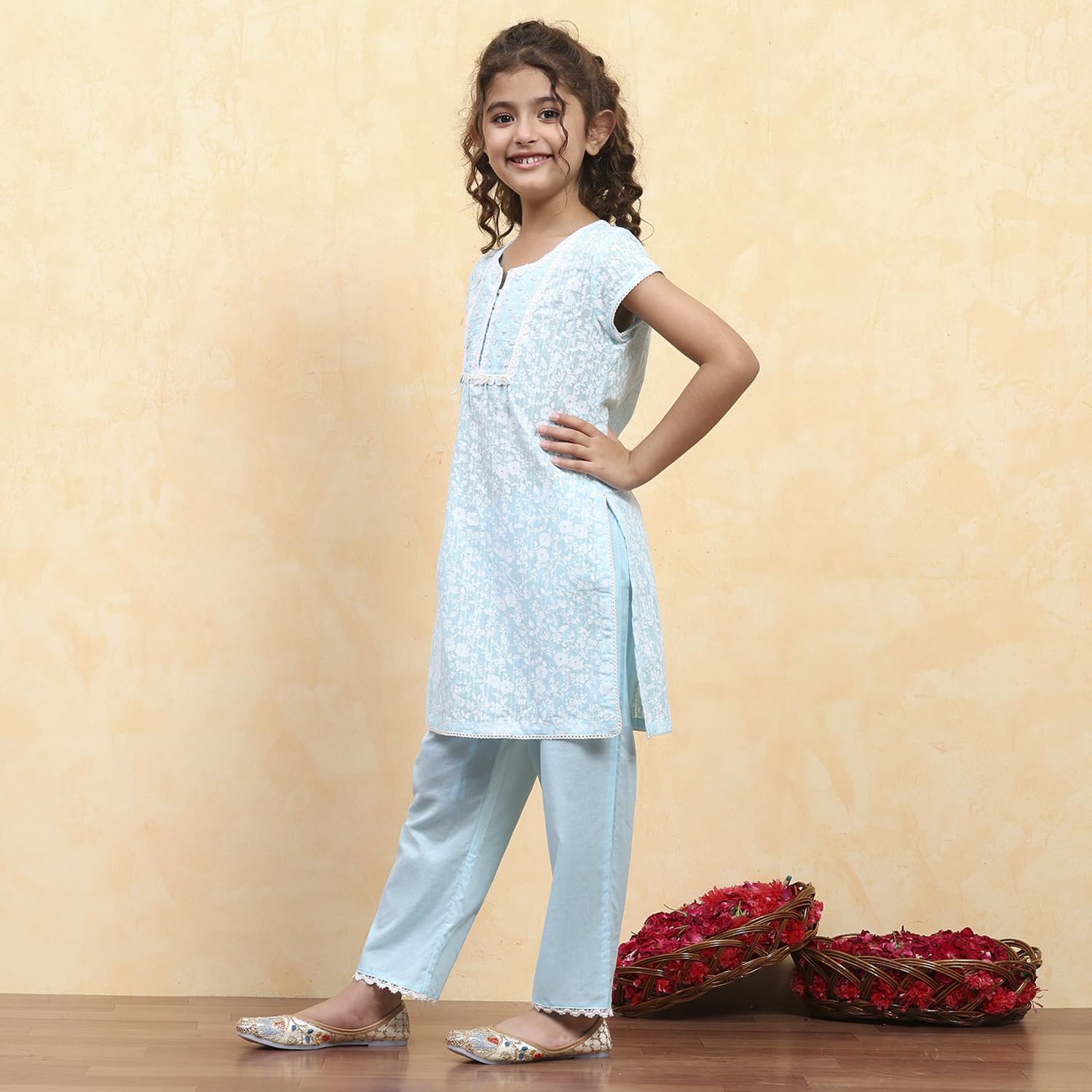 Biba Girl's Powder Blue Cotton Straight Printed Kurta Pants Set