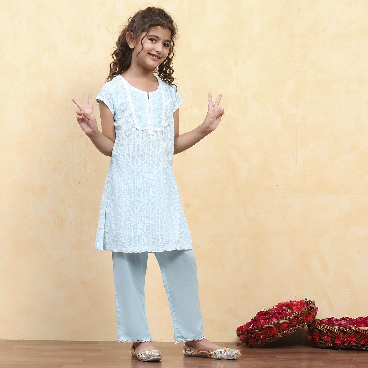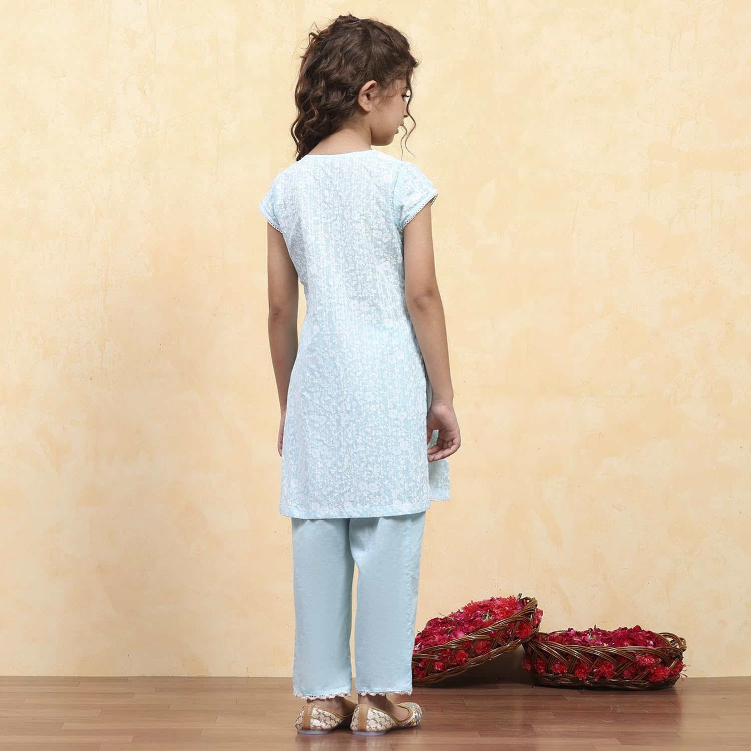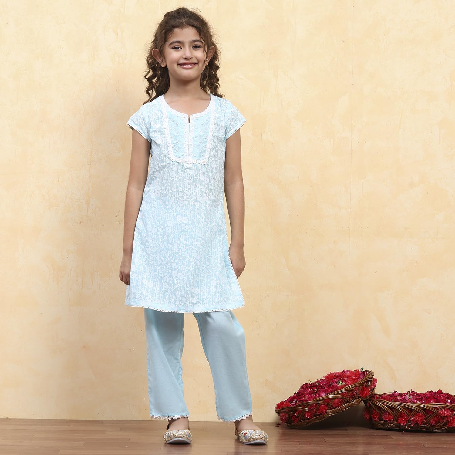 Biba Girl's Powder Blue Cotton Straight Printed Kurta Pants Set
