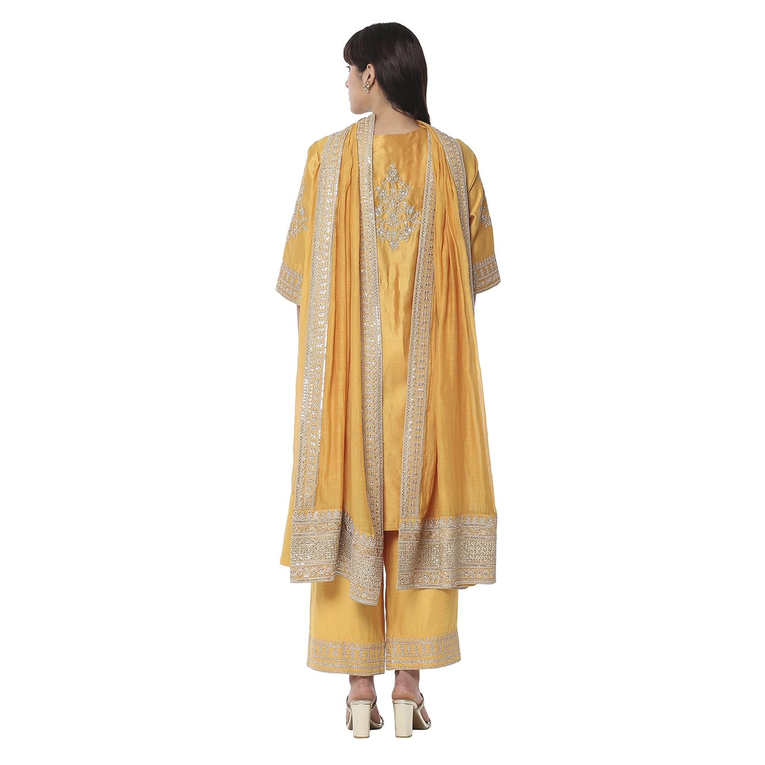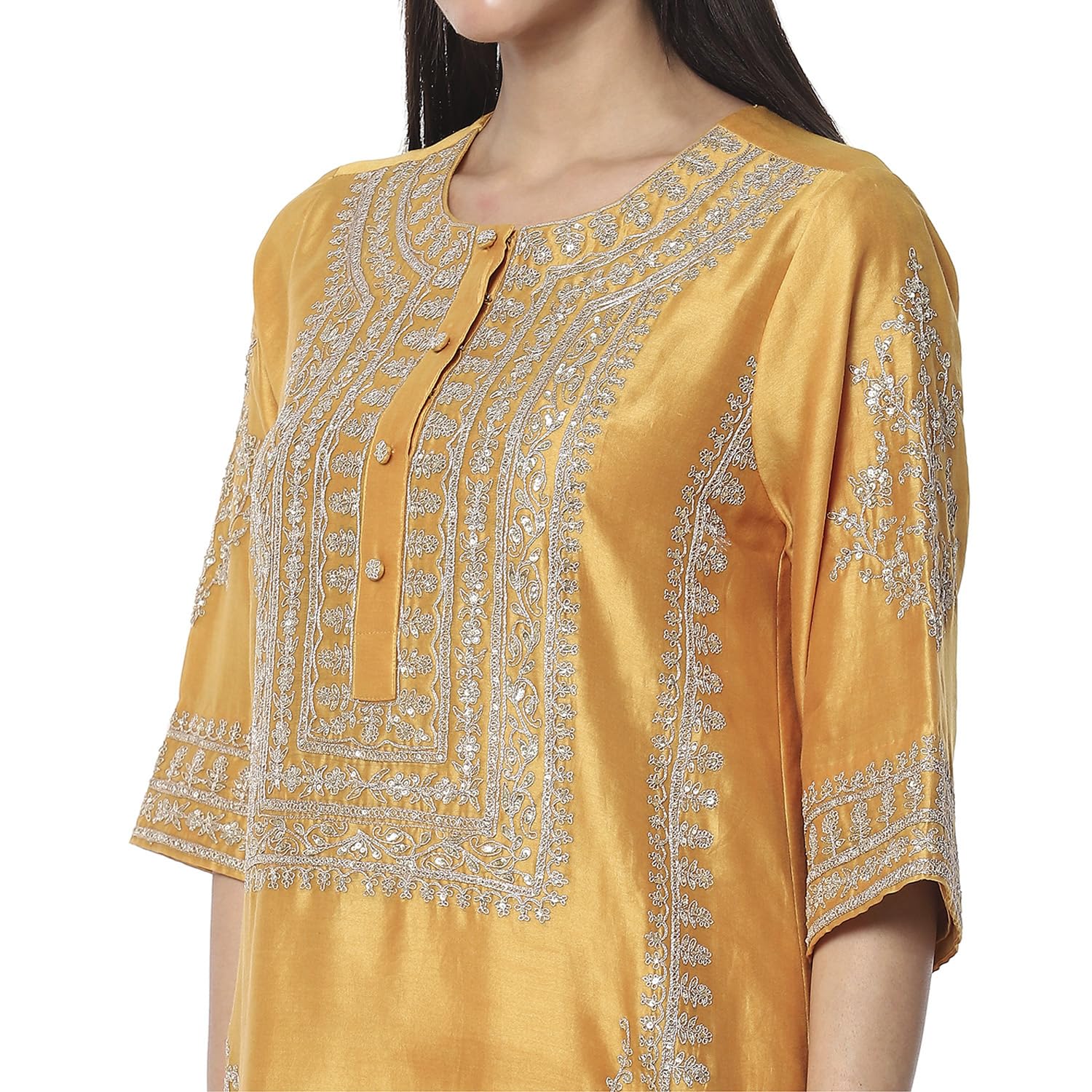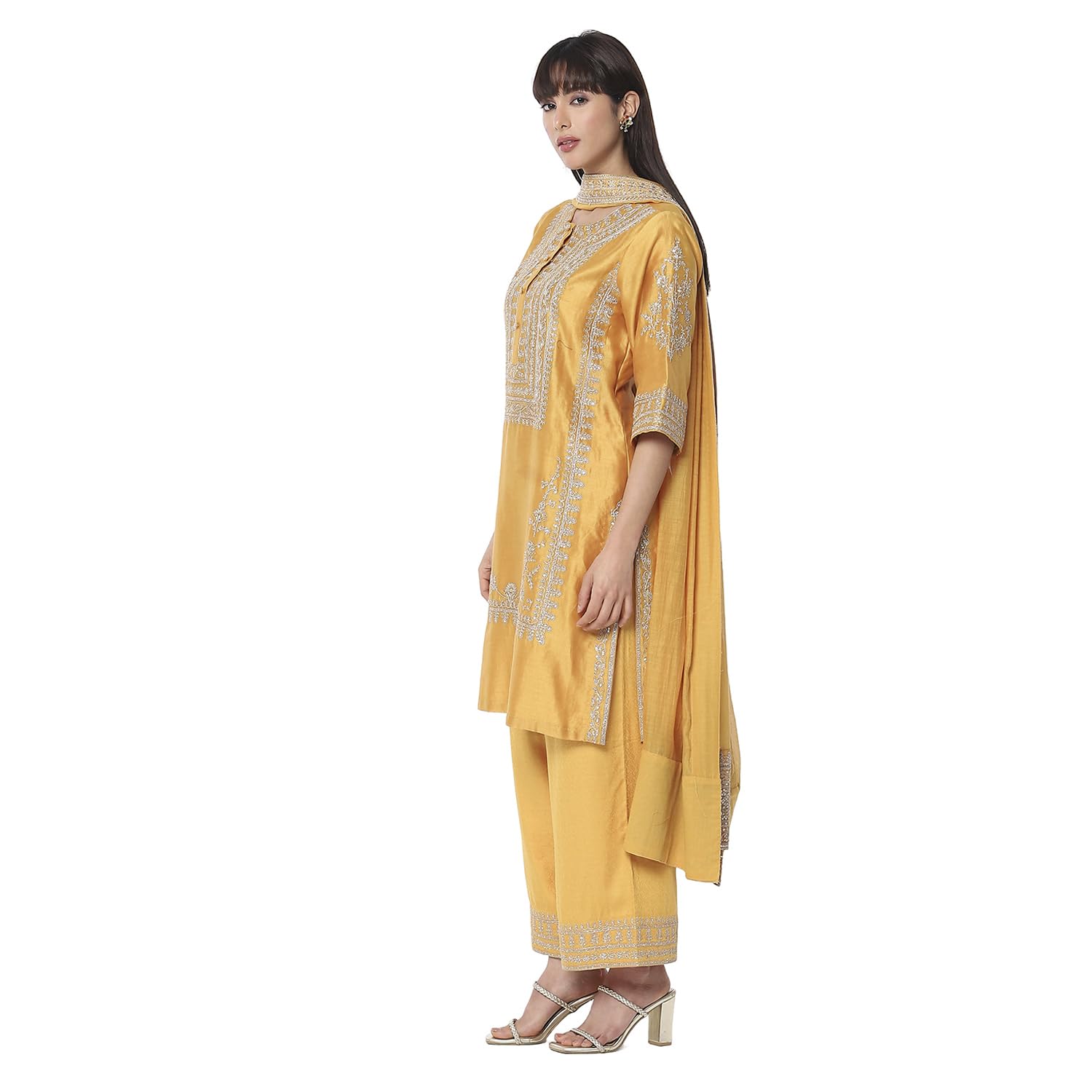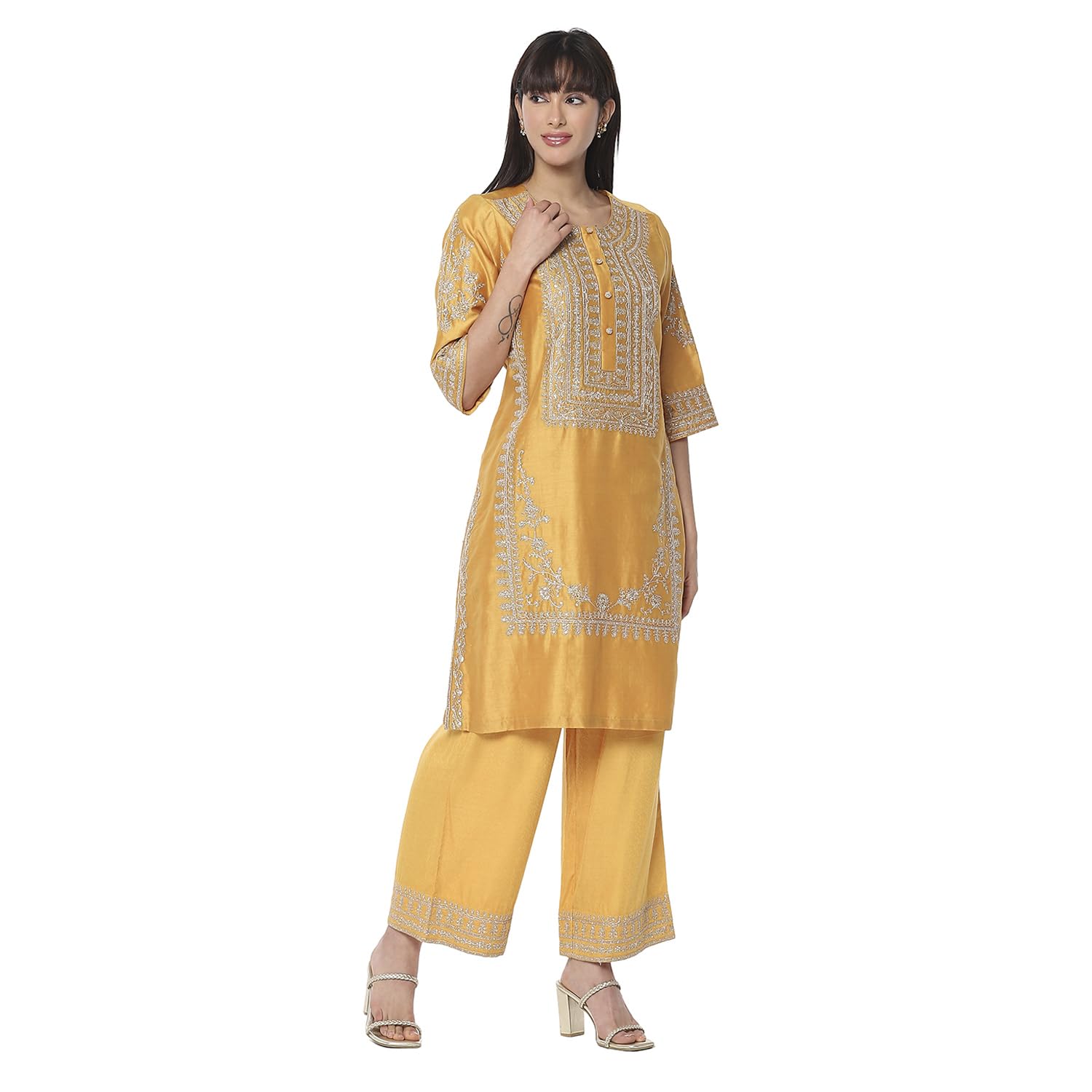Biba Women Ochre Yellow Cotton Silk Straight Kurta Set