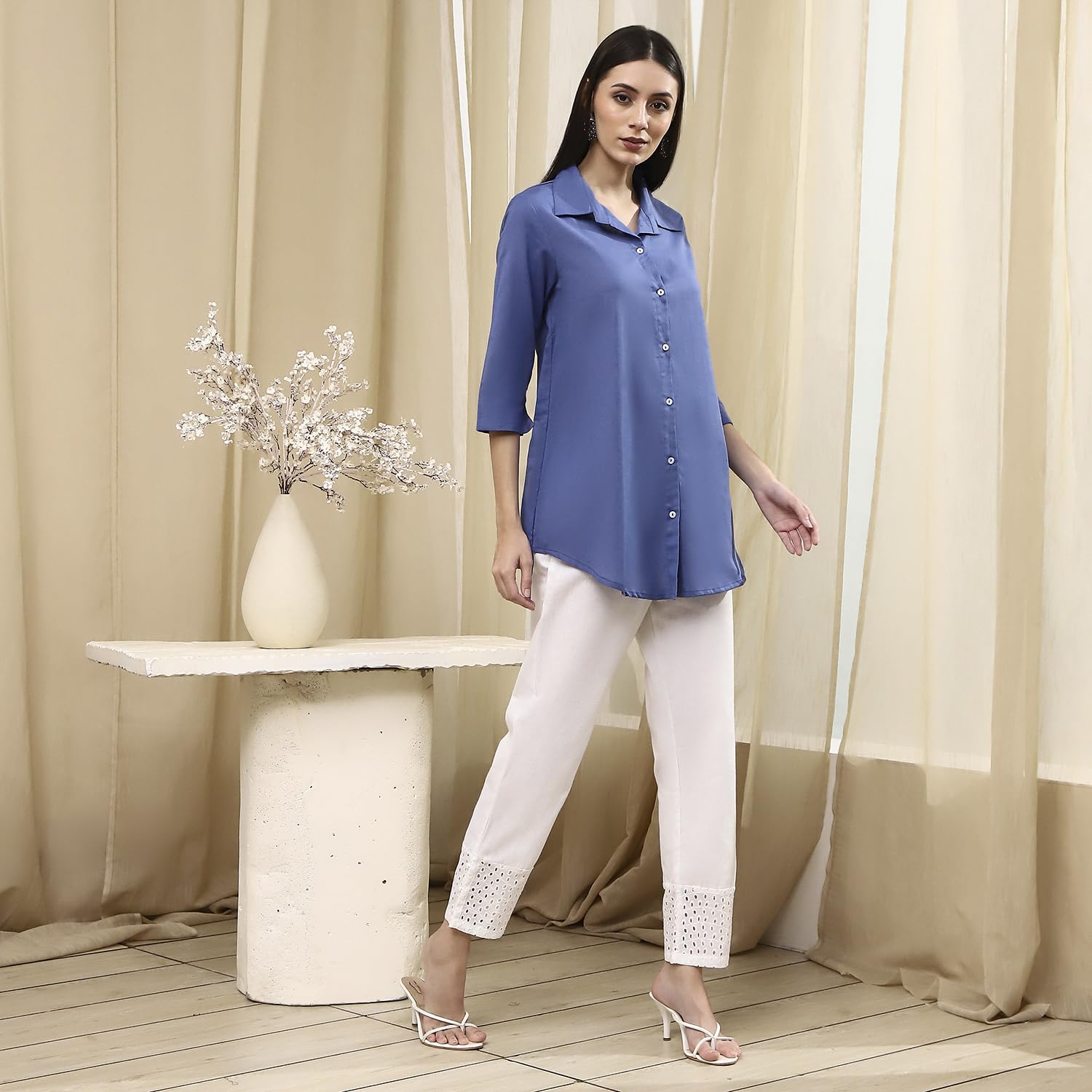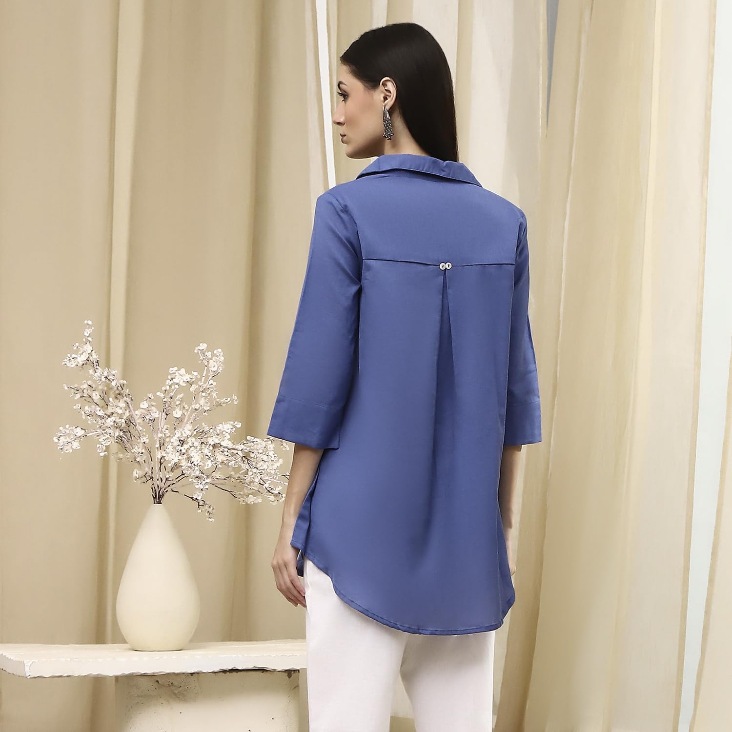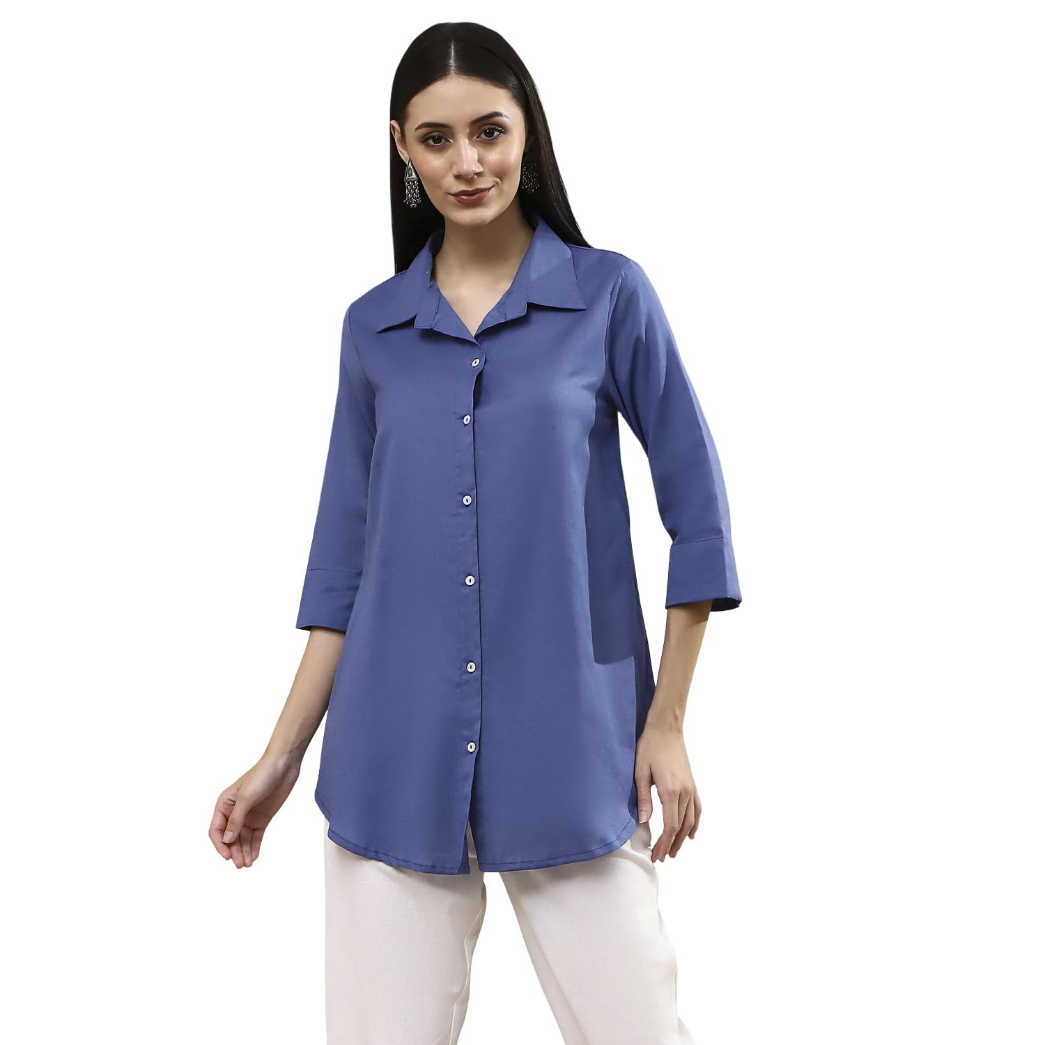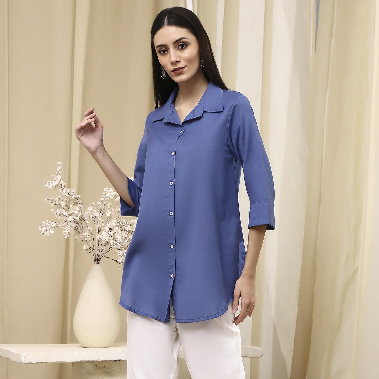 BIBA Women's Cotton Blend Solid Regular Shirts (SLDCR21577EAW24DSBLU_Dusk Blu
