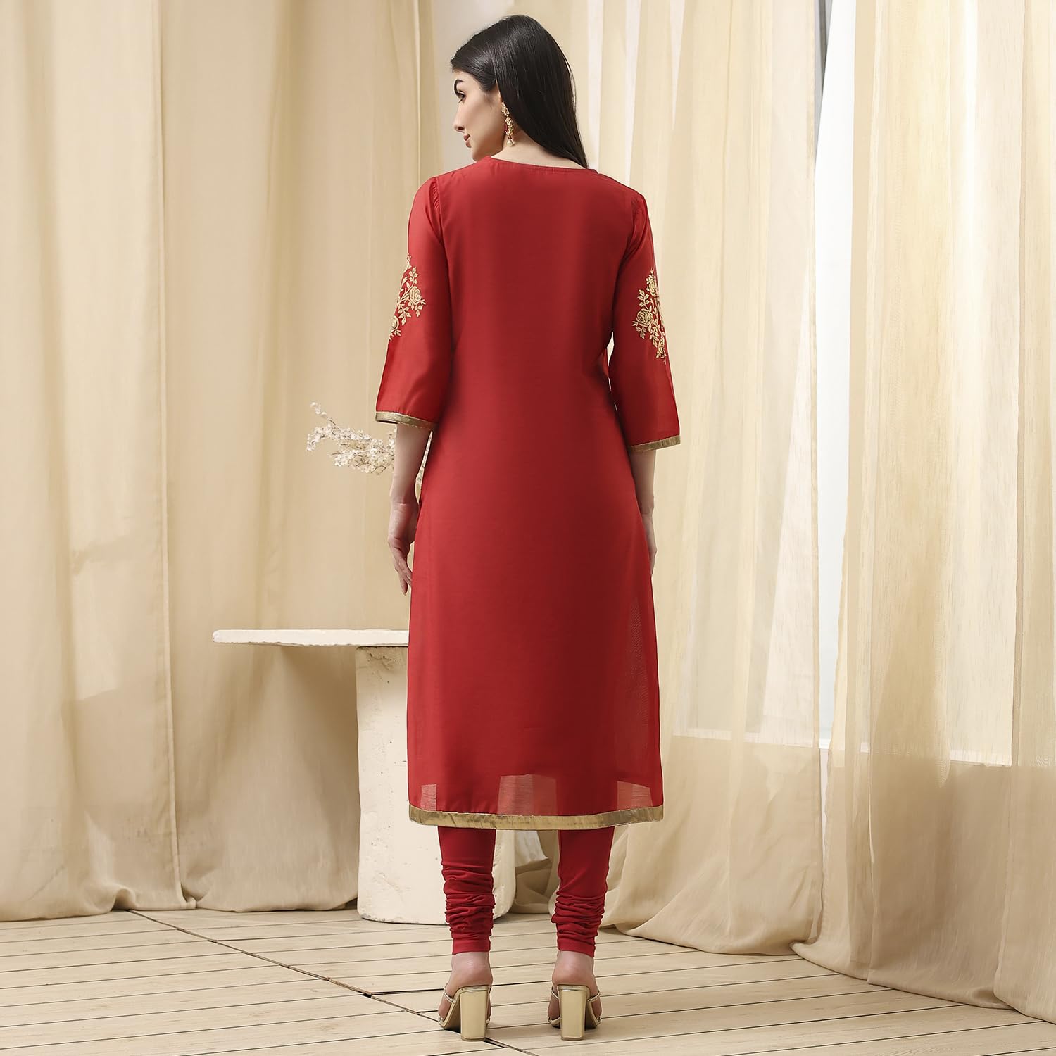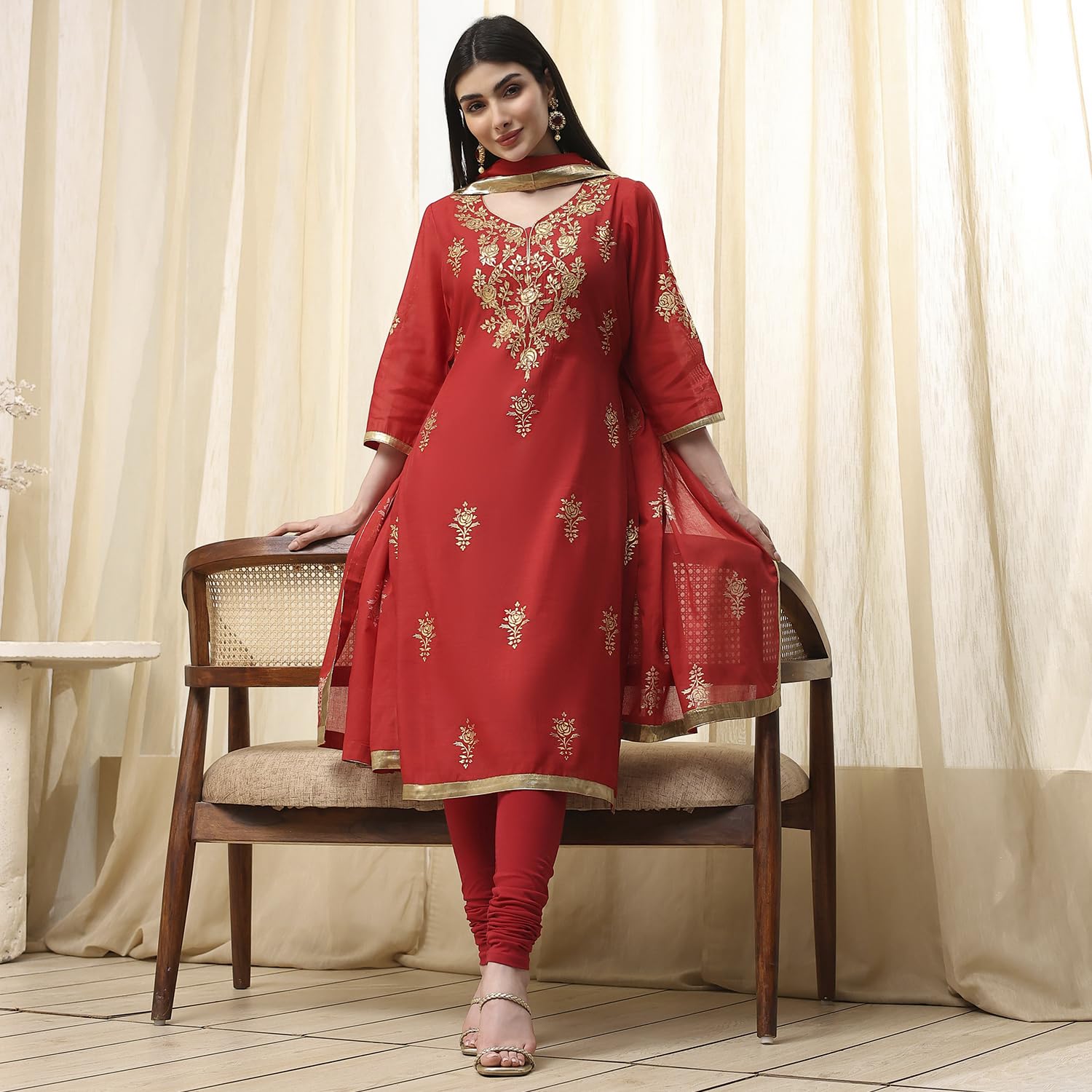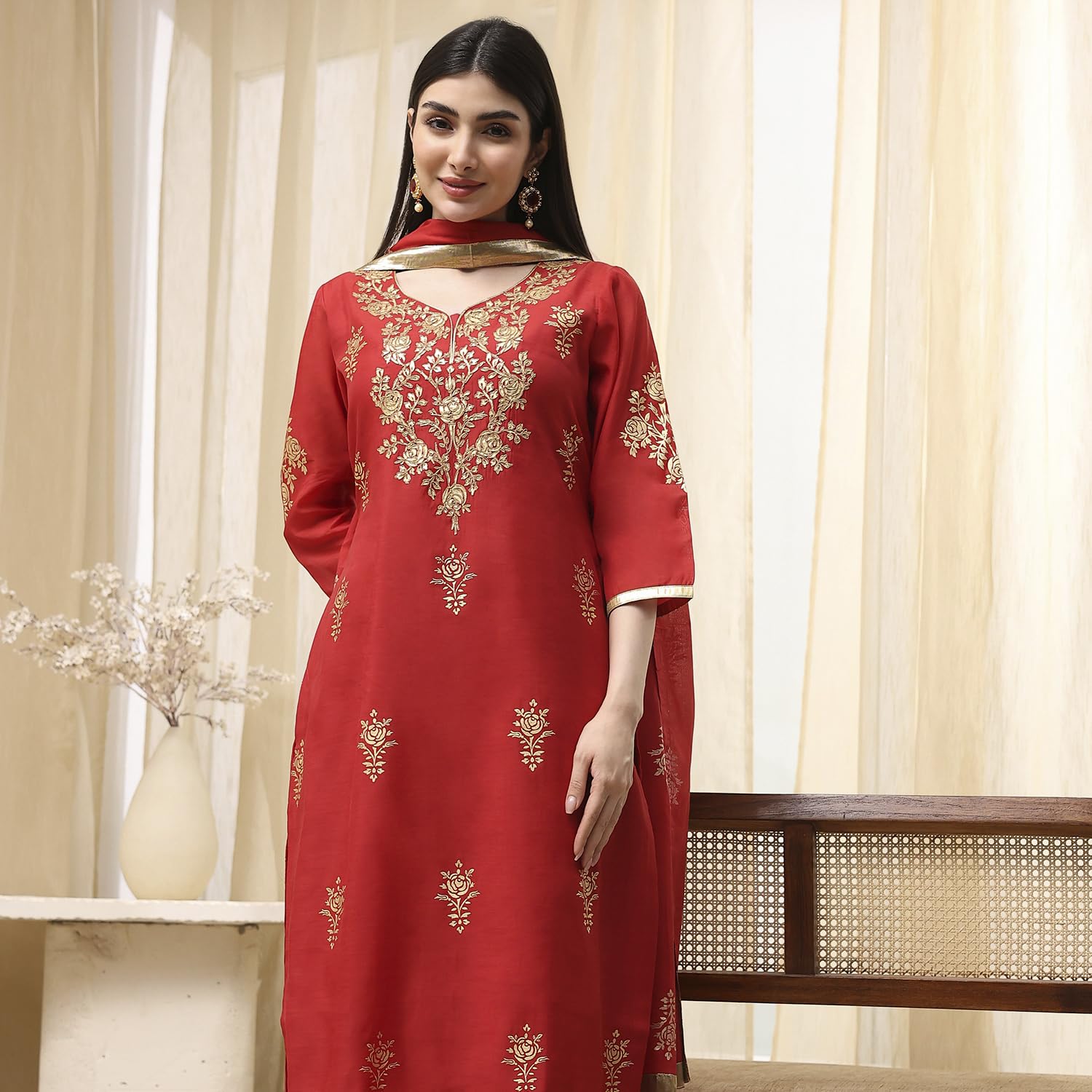 Biba Women's Poly Chanderi Kurta Set (SKDASRT7716ESS25RED_Red