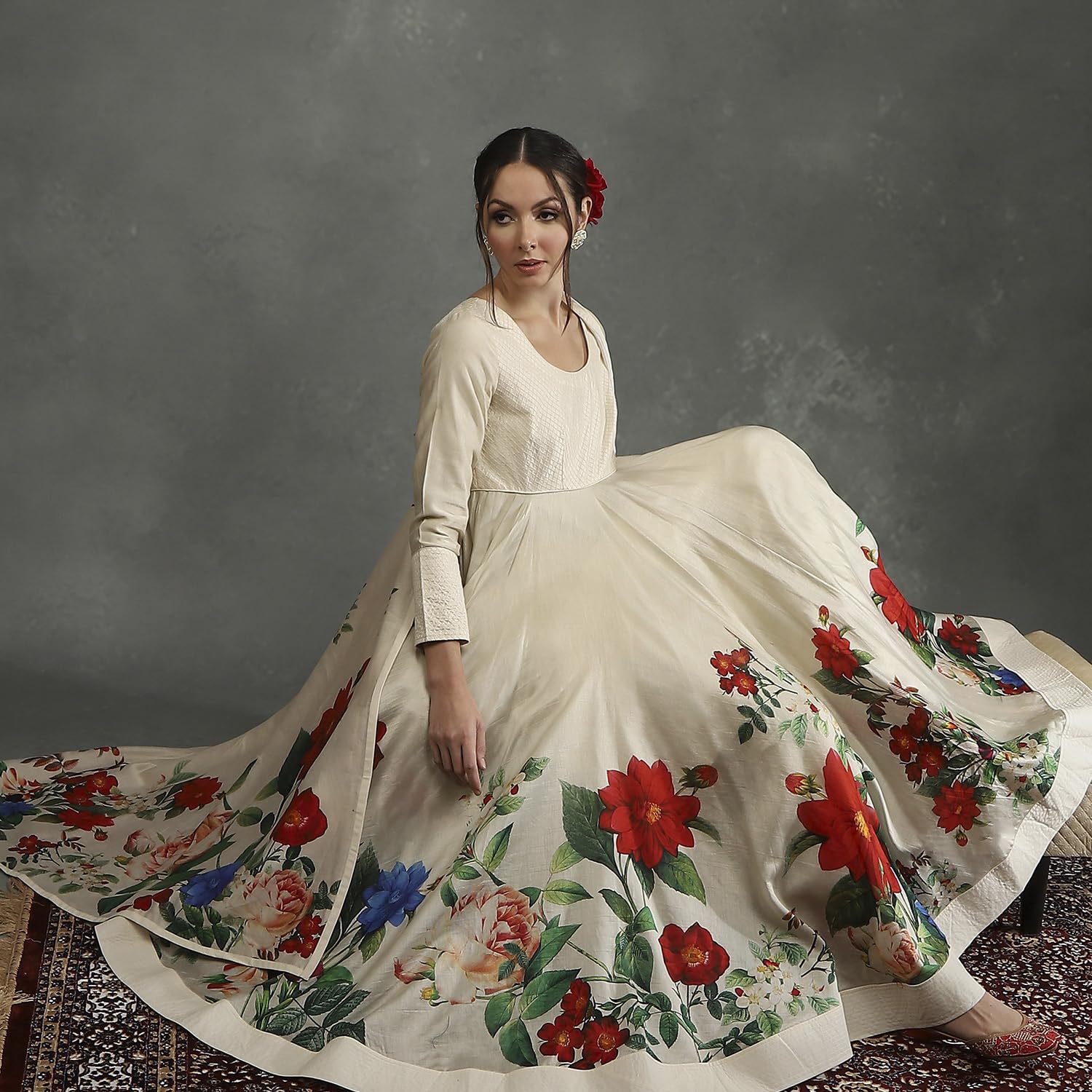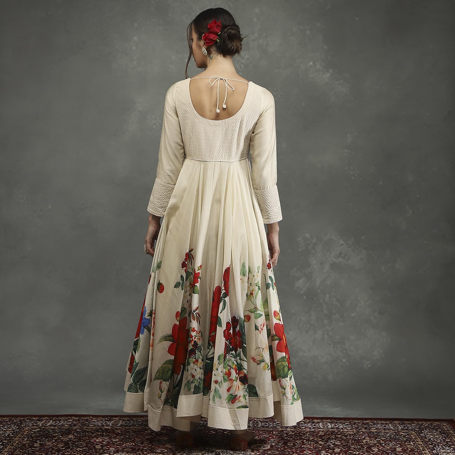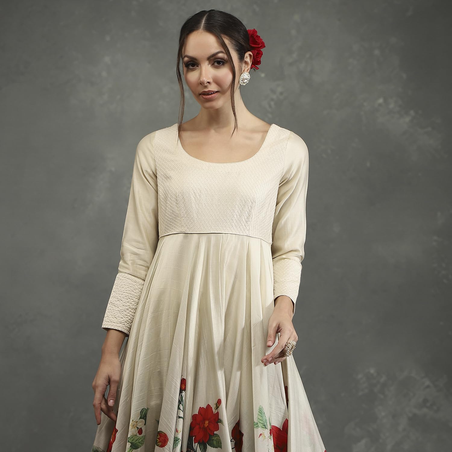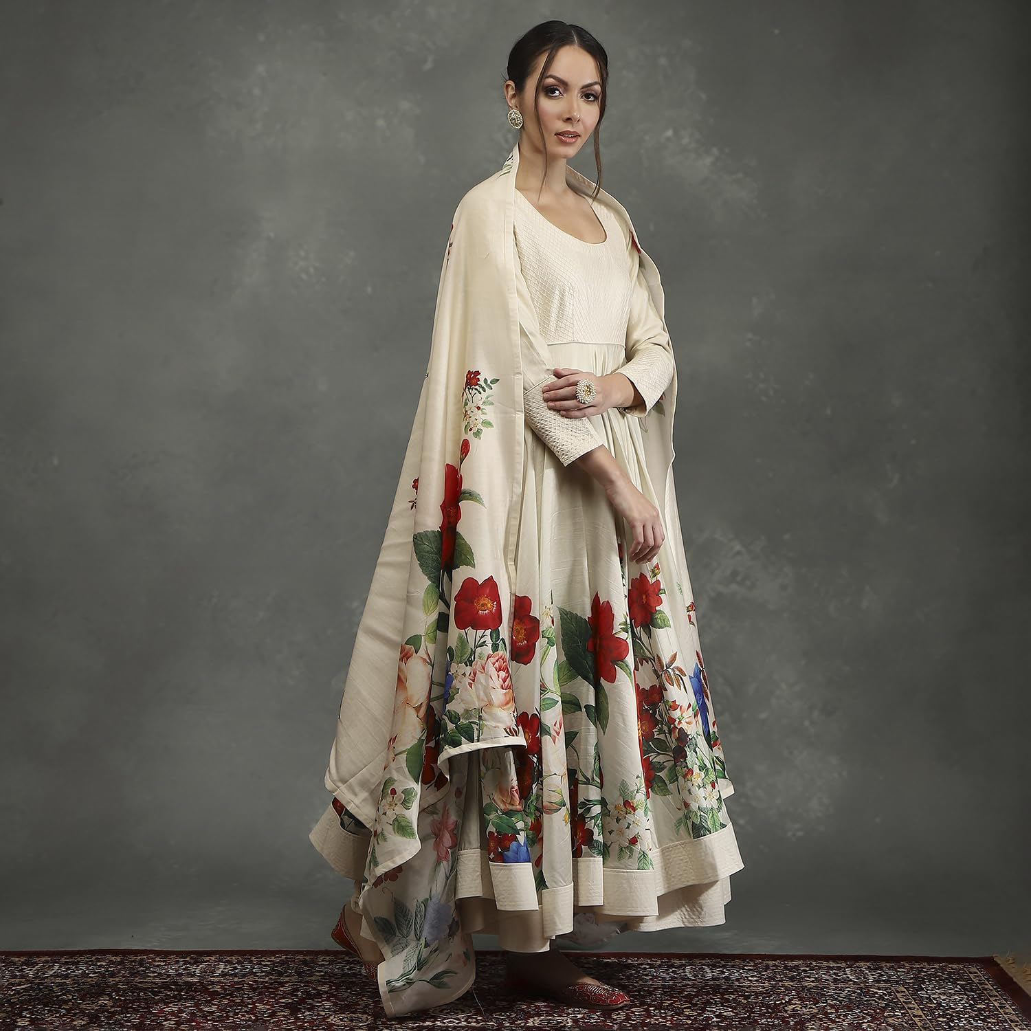 Biba Women Rohit Bal Off-White Silk Chanderi Floral Anarkali Suit Set