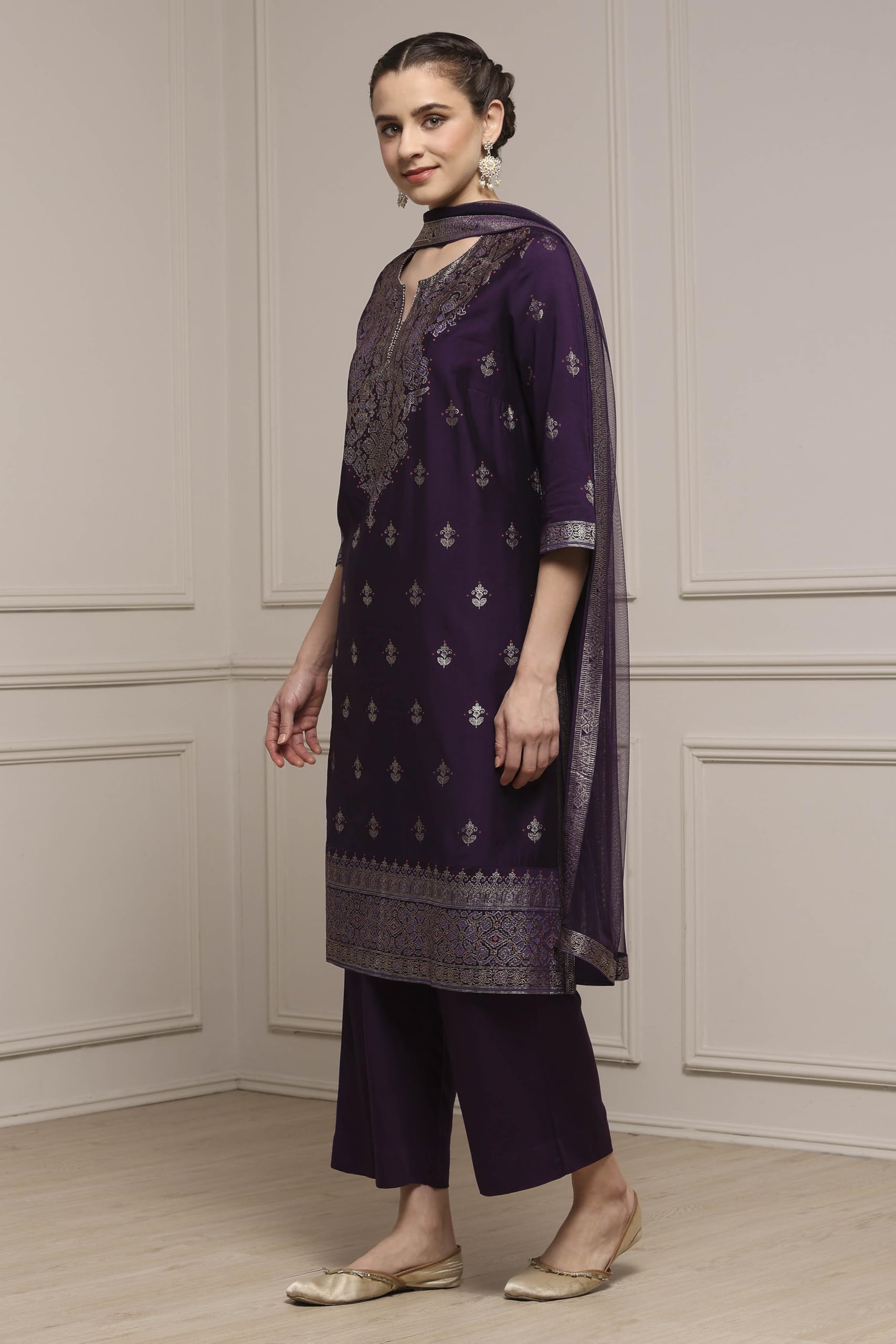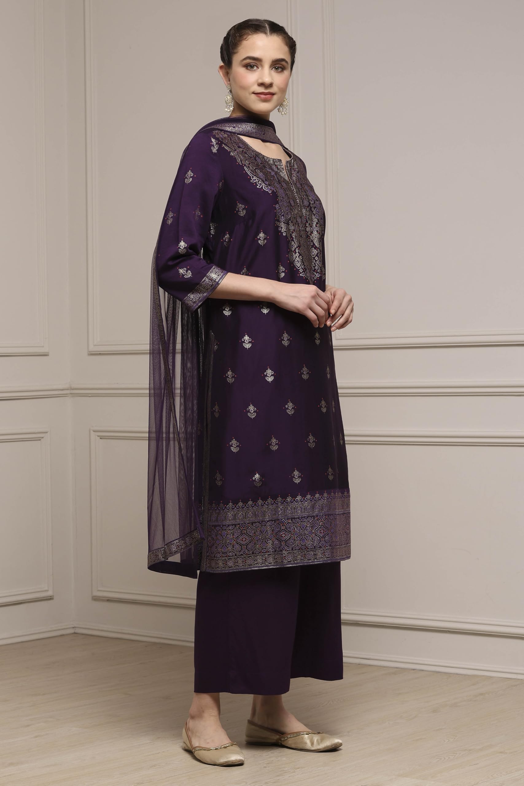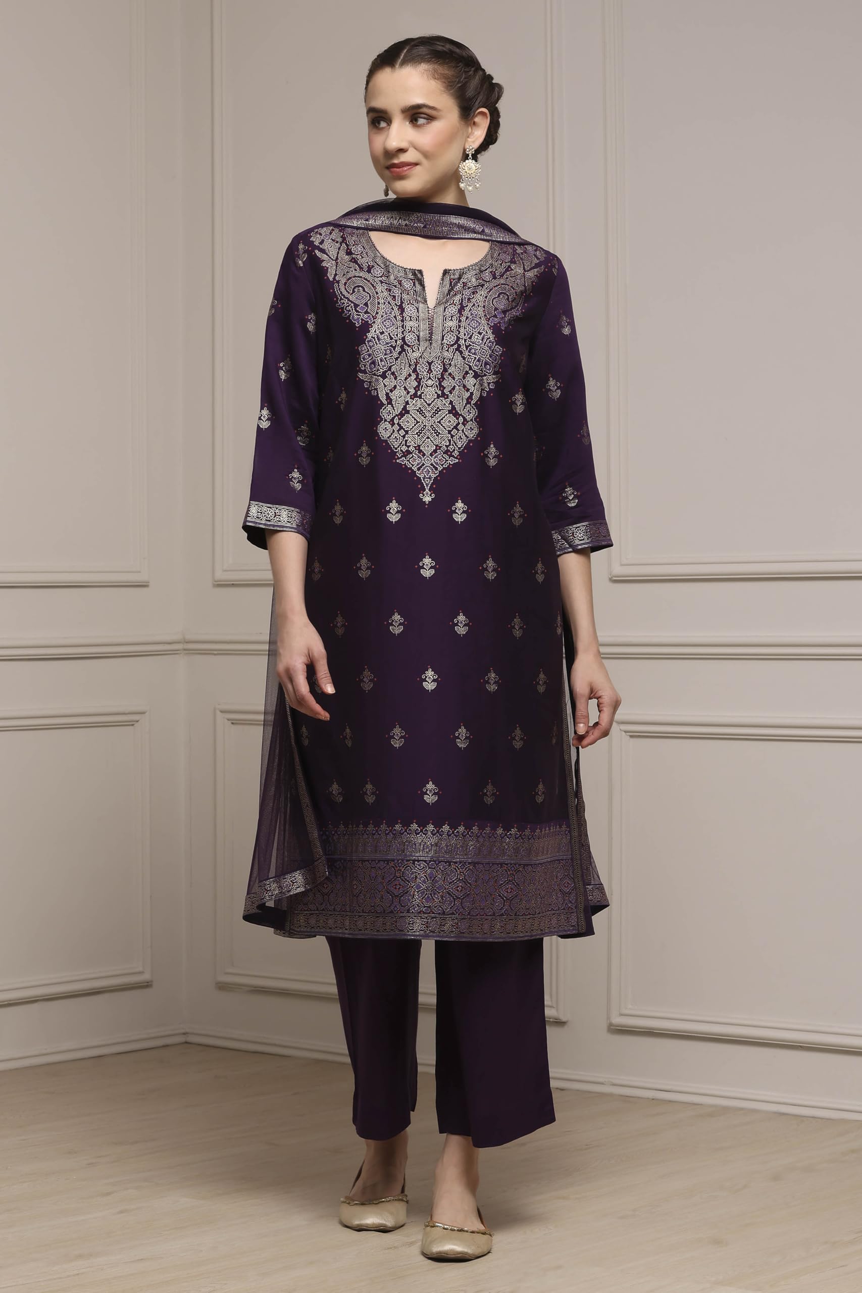 Biba Women Purple Viscose Blend Straight Printed Suit Set