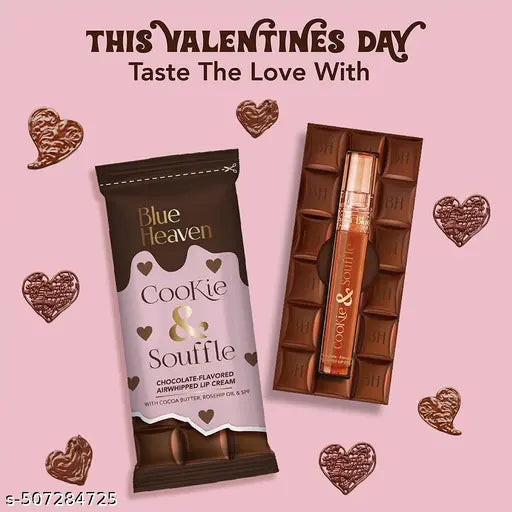 Blue Heaven's Cookie & souffle Chocolate Flavored Lip Cream is a lip treat with a velvety texture that's as rich as a gourmet chocolate. Delivering the boldness with the lightness of a chocolate souffl, it's a perfect gift to your loved ones this Valentine's. Whipped to pure cocoa perfection, it dances on your lips, leaving an impact that's as delightful as chocolate dreams. Crafted with love, this creamy concoction not only serves up a luscious matte finish but also spoils your lips with the goodness of Cocoa Butter and Rosehip Oil with 6 heavenly chocolate aromas and a dazzling array of 12 nude shades. It's not just a lip cream; it's a chocolate-infused sensation that'll sweeten your day and keep your lips feeling utterly delicious.