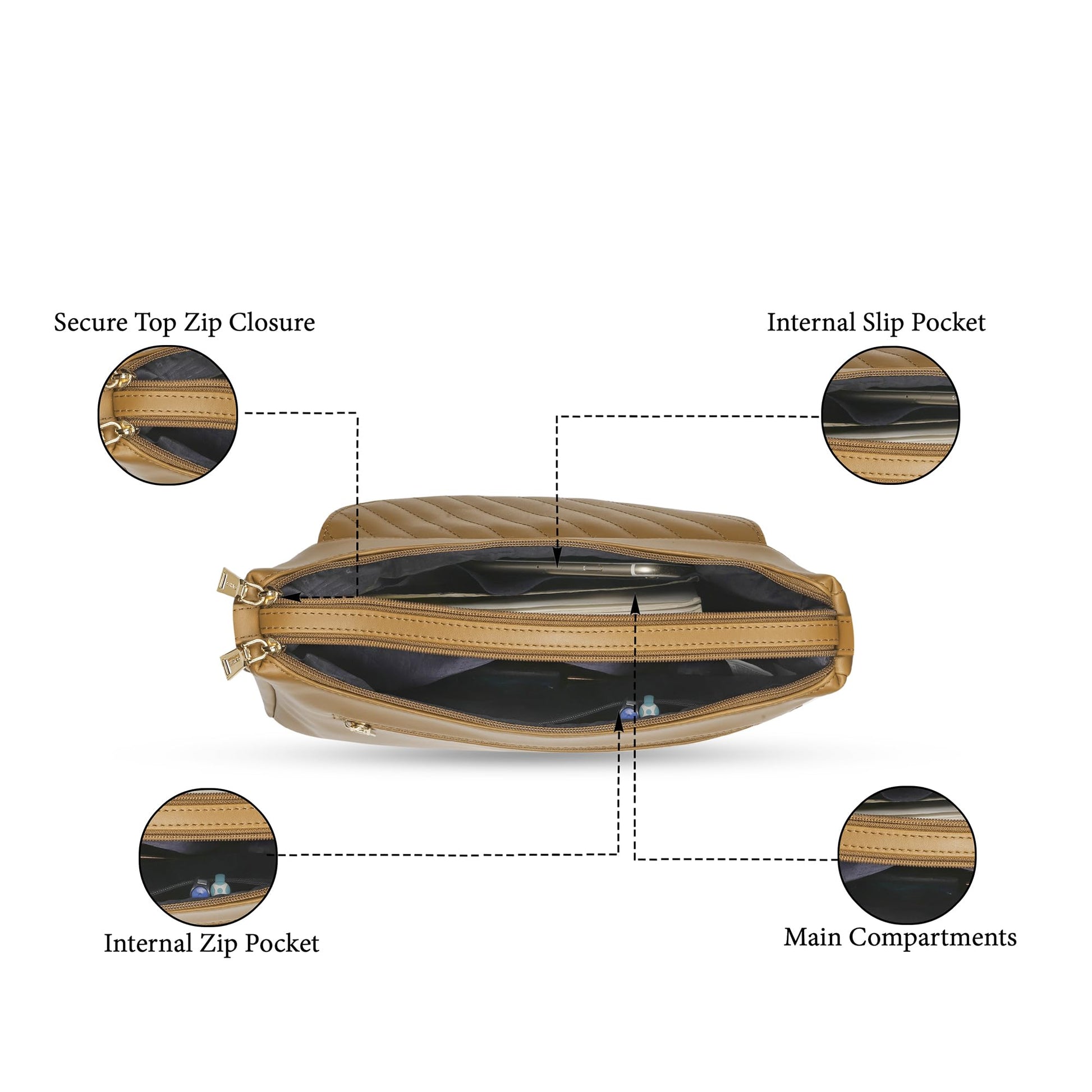 - Spacious & Organized: Well-designed interior with multiple compartments, pockets, and a back zip to keep your essentials organized and easily accessible.