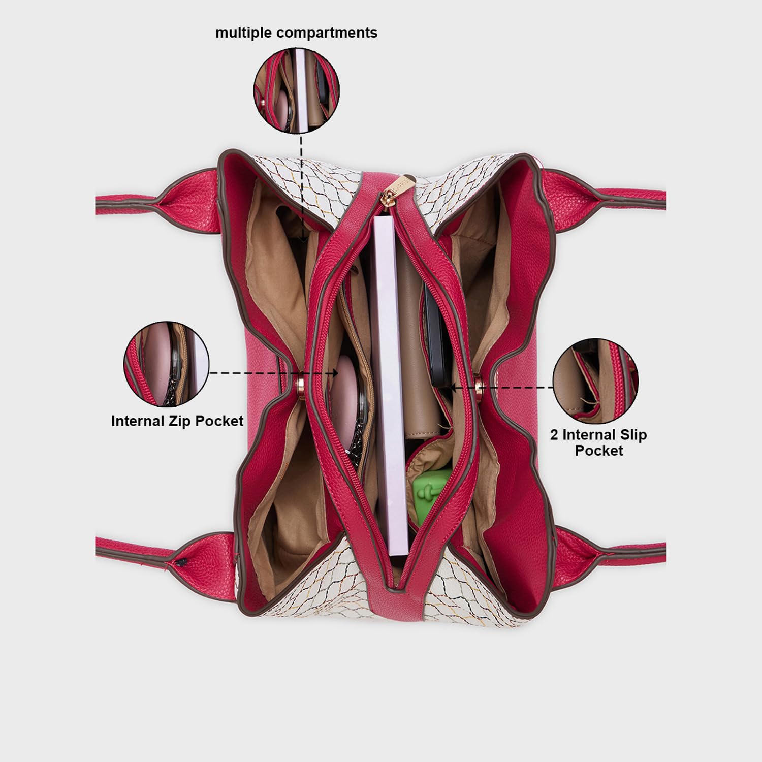 - The spacious interior ensures ample room for all your essentials, seamlessly blending fashion and utility into a stylish, functional accessory.