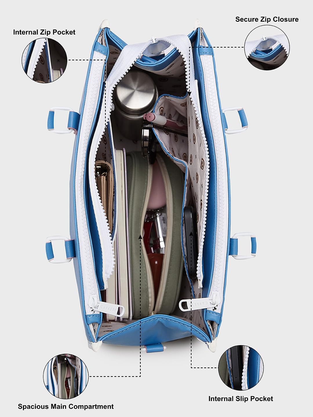 Caprese Vivian Tote Medium Blue Bag for Women|Adjustable & Detachable, Stylish, Durable, Multi-Compartment Design for Work, Travel, Shopping with Back Zip| Large Capacity, Comfortable Straps.