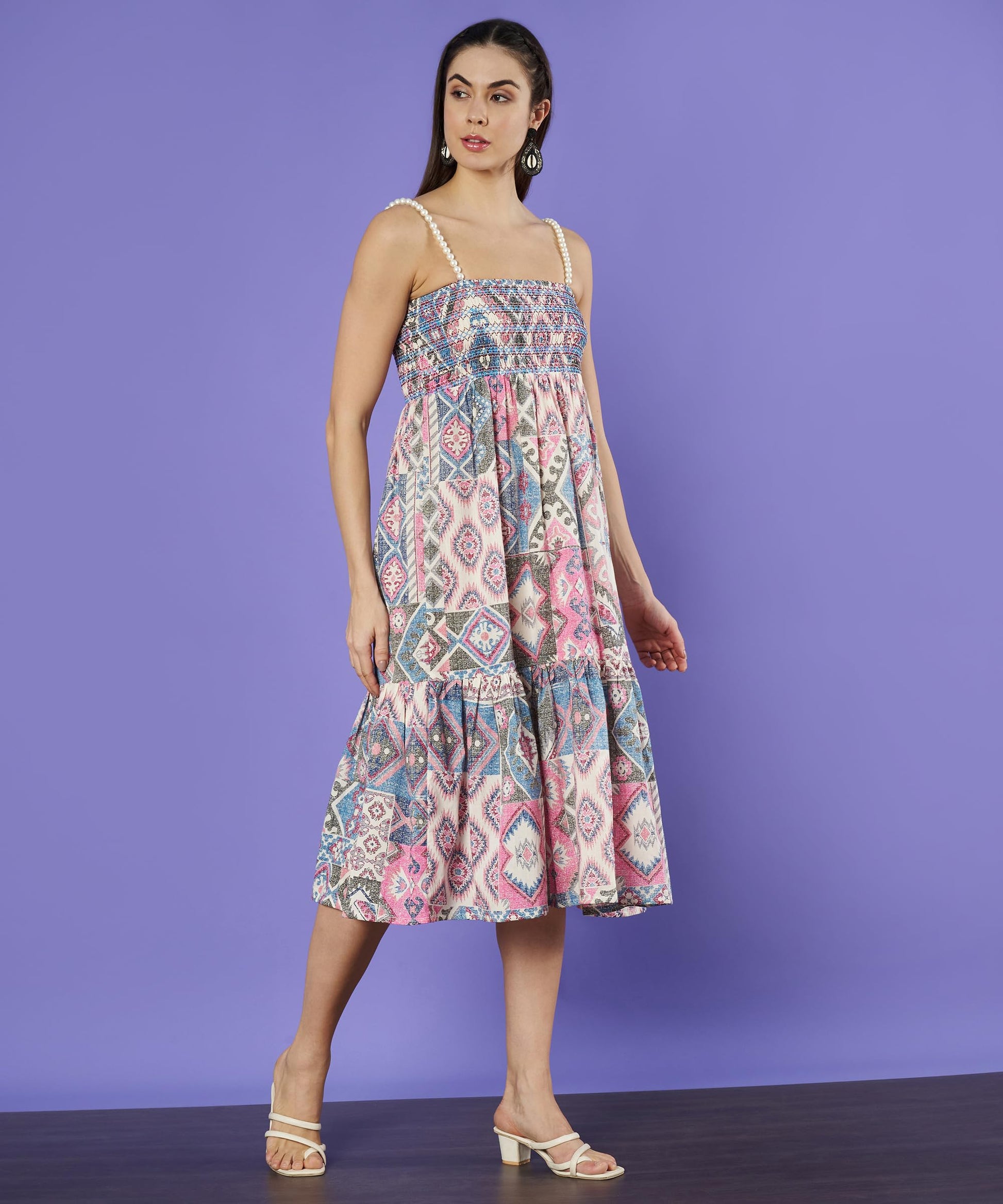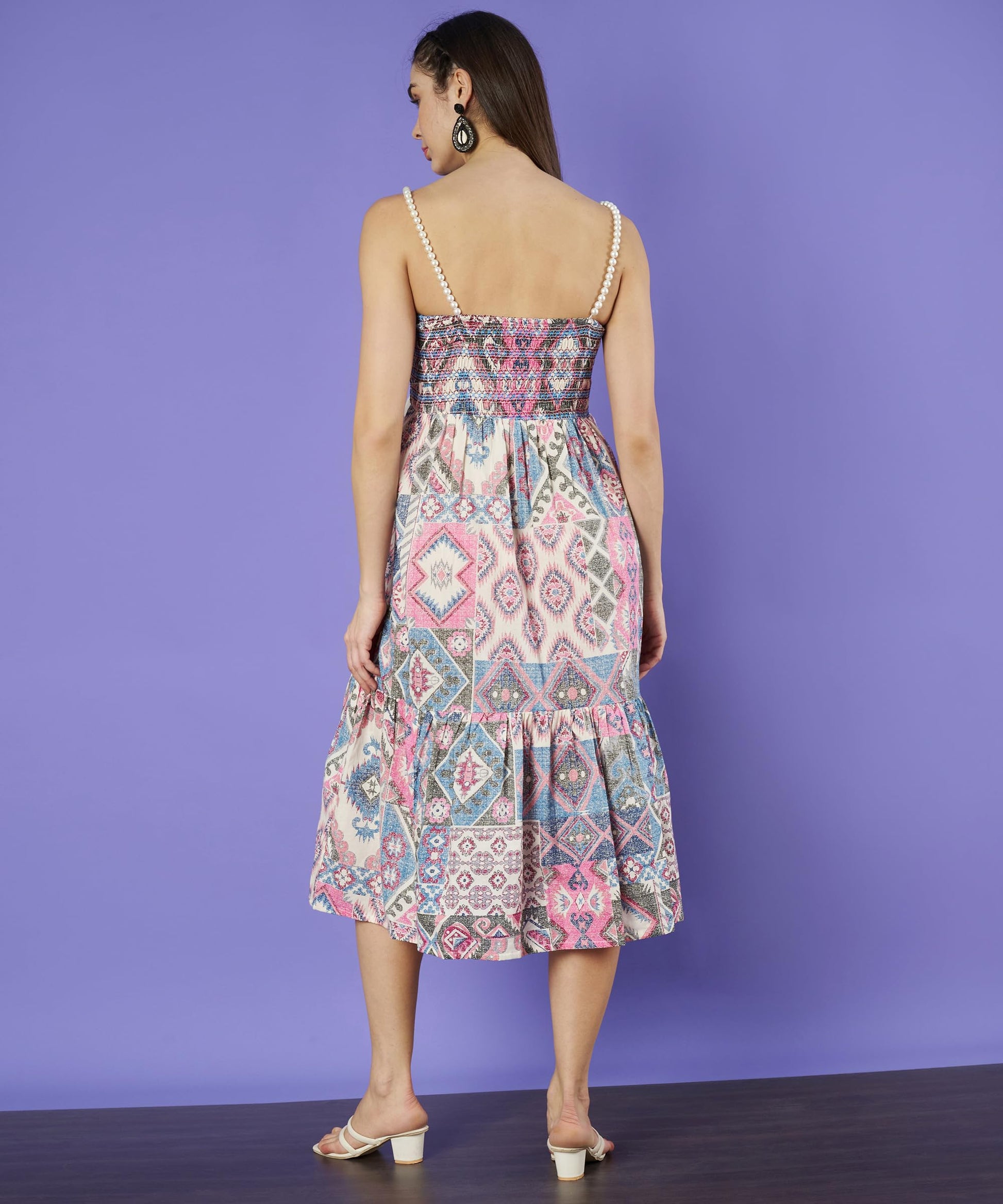 COTLAND Fashions Beaded Strap Smocked Sleeveless Cotton Dress for Women (Mystic Gleam)