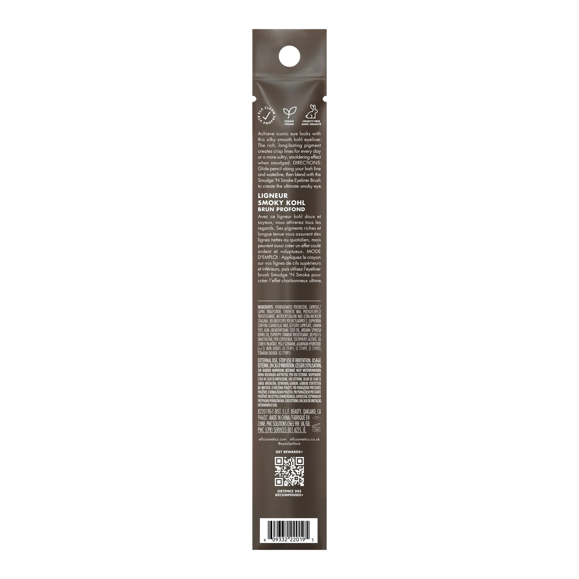 Details: Play it kohl. e.l.f. Cosmetics’ silky smooth Smoky Kohl Eyeliner pencil lets you create iconic eye looks—from smudged lash lines for every day to smoldering, smoky effects. The richly pigmented, blendable formula easily smudges for a bold, long-lasting look. Get all sultry shades. What it is: A silky smooth kohl eyeliner pencil for creating sultry, smoky looks. Why you'll love it: Smooth-glide formula blends and smudges easily Delivers richly pigmented color Ingredients may change or vary from time to time. Please refer to the packaging of the product received for the list of ingredients in your particular product. Proud to be 100% Vegan, Cruelty-Free and Leaping Bunny Certified. Because kindness is chic.