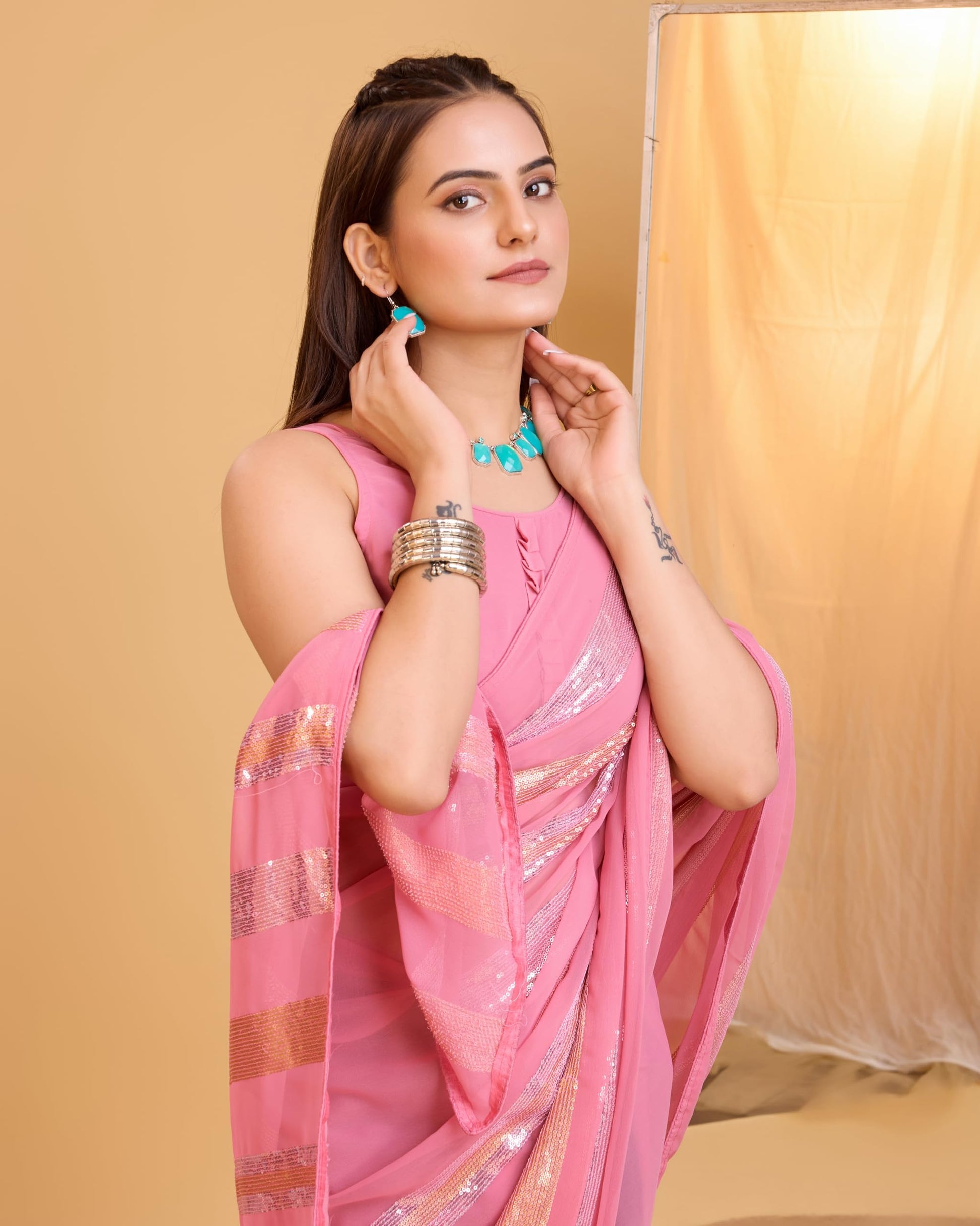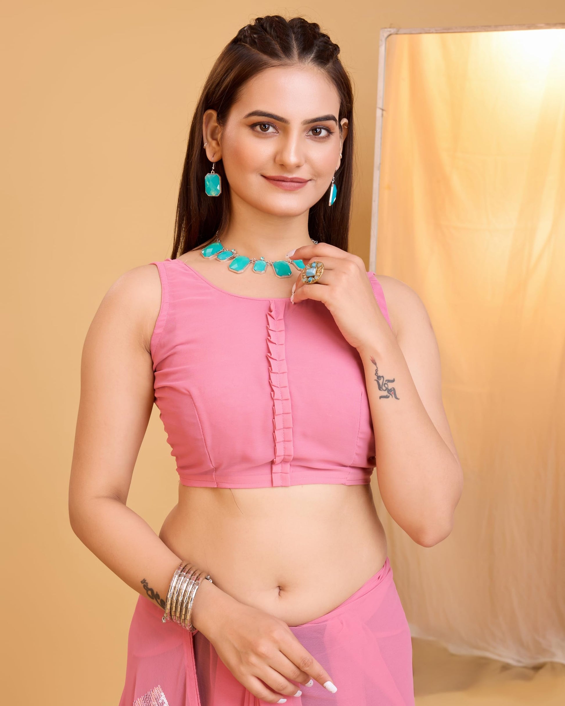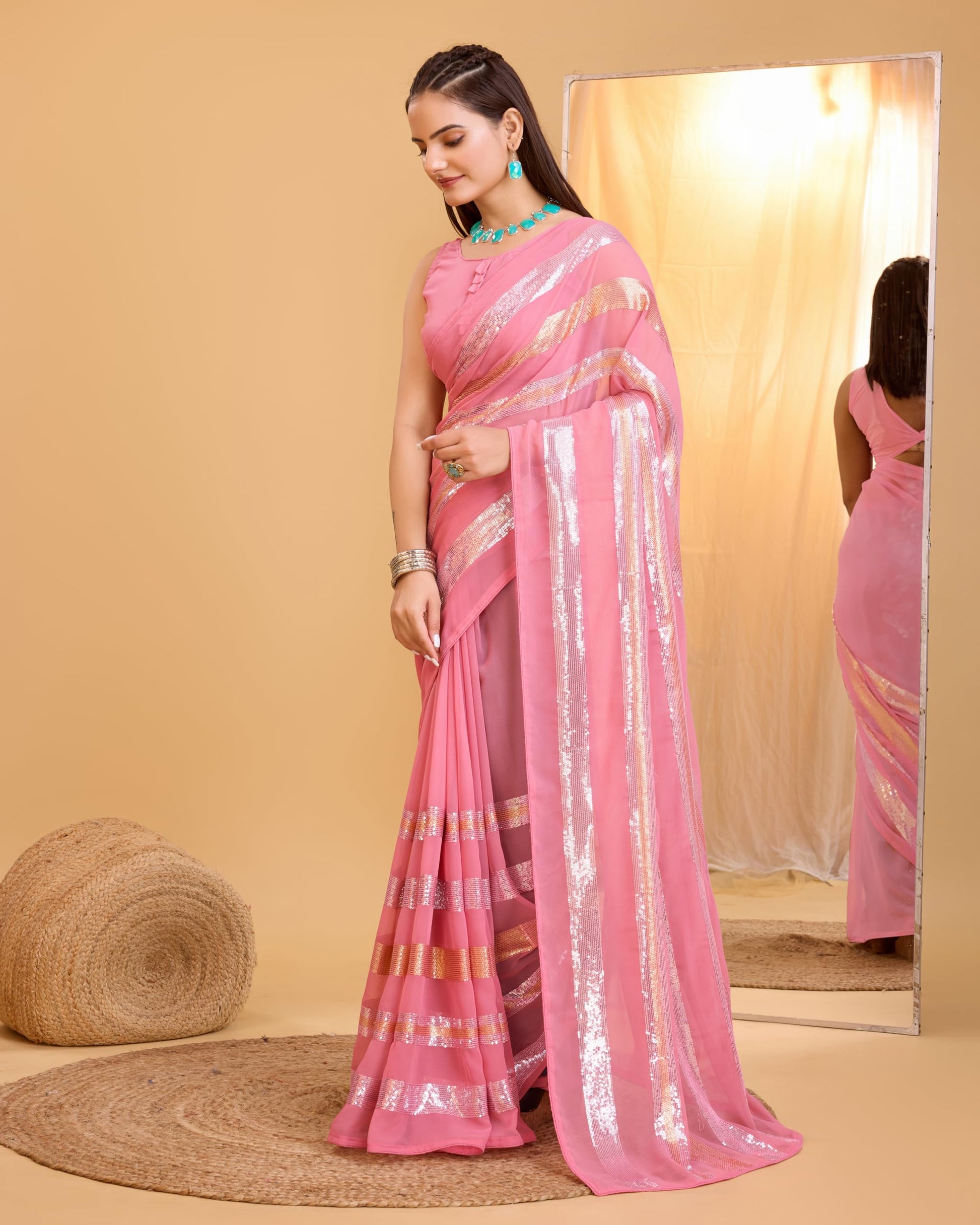 - 𝐒𝐚𝐫𝐞𝐞 𝐅𝐚𝐛𝐫𝐢𝐜 : Saree colour: Pink| Material: Georgette| Length: 5.5 mtr