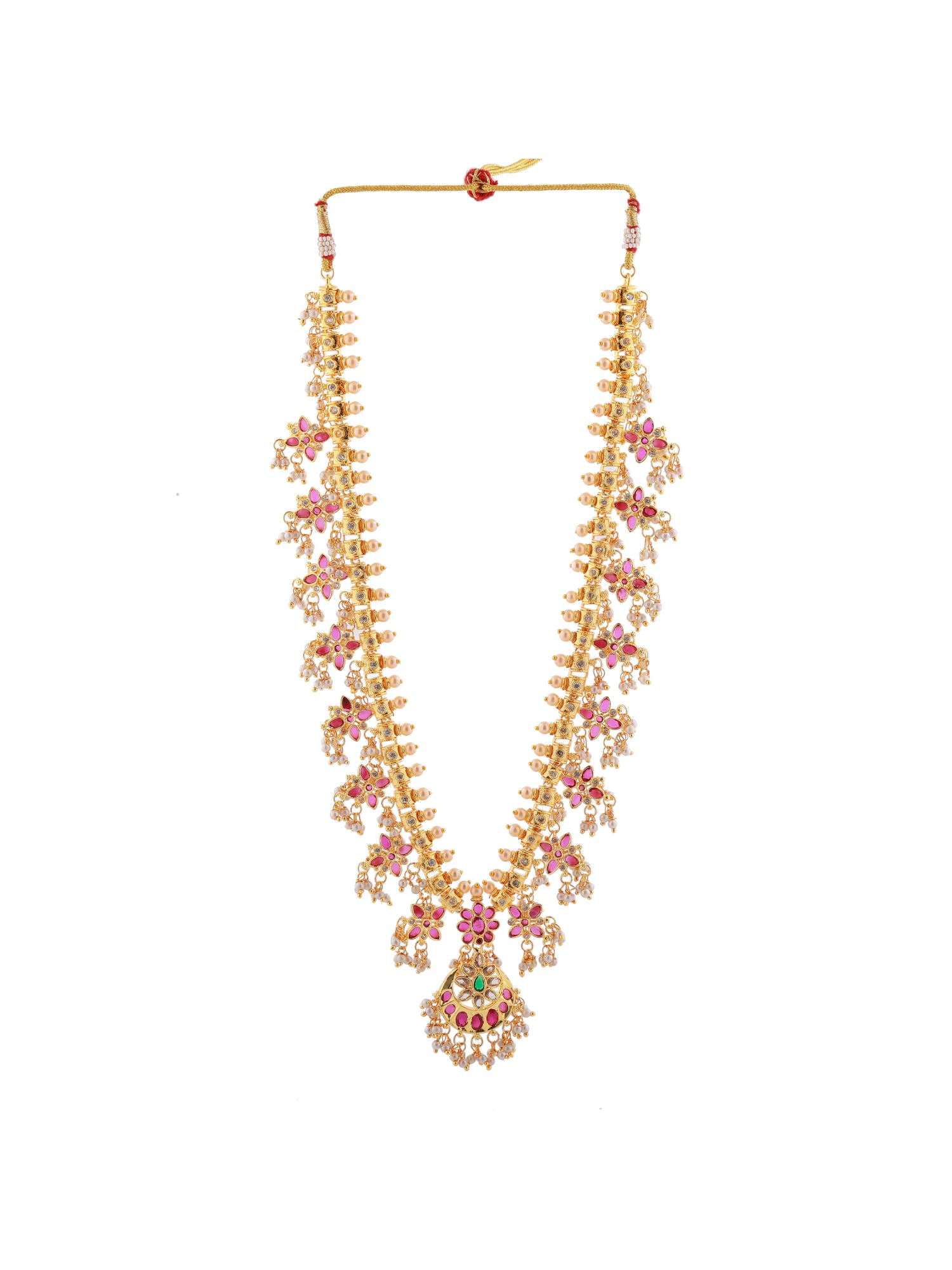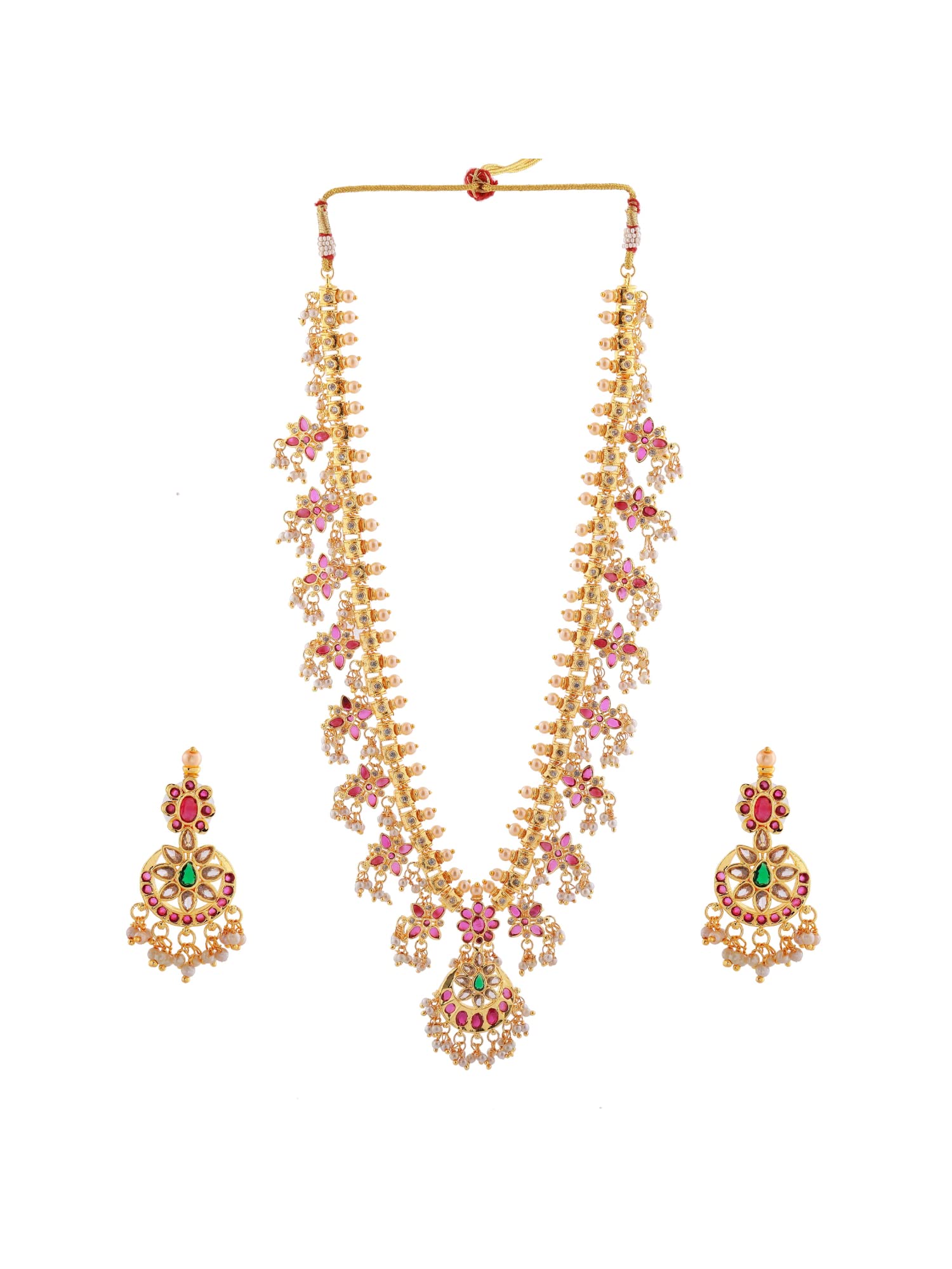 - Package Contents: 1 Necklace & 1 Pair Earring; Material: Brass; Dimensions: 43 CM x 2.8 CM ; Item Weight: 121.000 Gms; Color: Gold; Pattern: Floral; Plating: Gold; Closure Type: Drawstring; Material: Brass