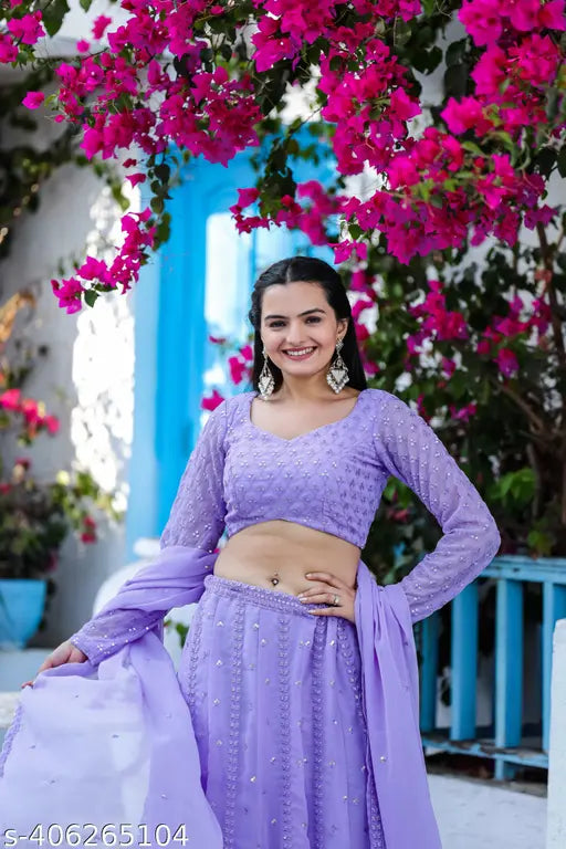 Georgette Embroidered Lehenga features a georgette blouse and georgette lehenga. Embroidery is completed with gota , mirror and resham. this style is made in India and checked by hand to ensure high quality.