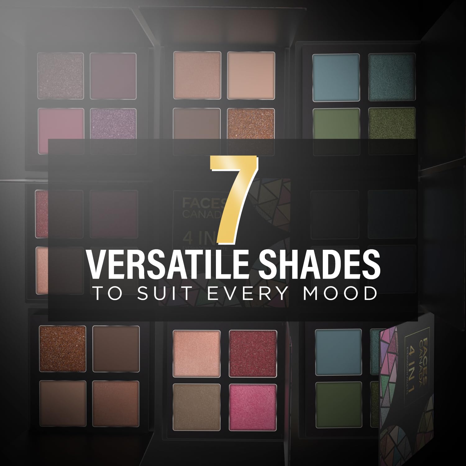 - VERSATILE SHADES: FACES CANADA 4 in 1 Eyeshadow palette comes in 7 exciting shades. From work appropriate - idyllic nudes, to party ready - indulgent colors, there is a palette for every mood and occasion.