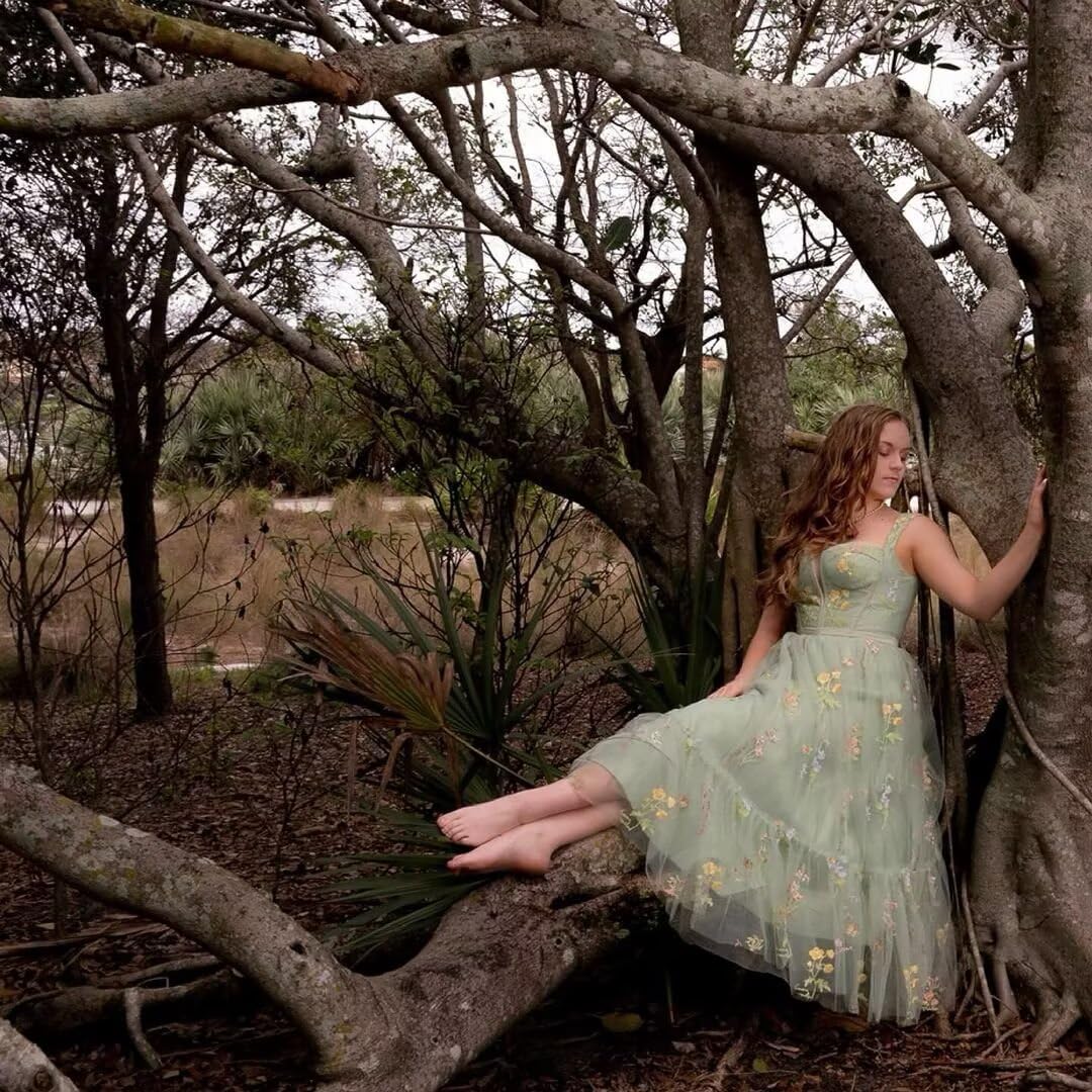 Fivsole Women's Midi Floral Prom Dresses Flower Embroidered Short Formal Tulle Evening Party Gown, Green-c, 6