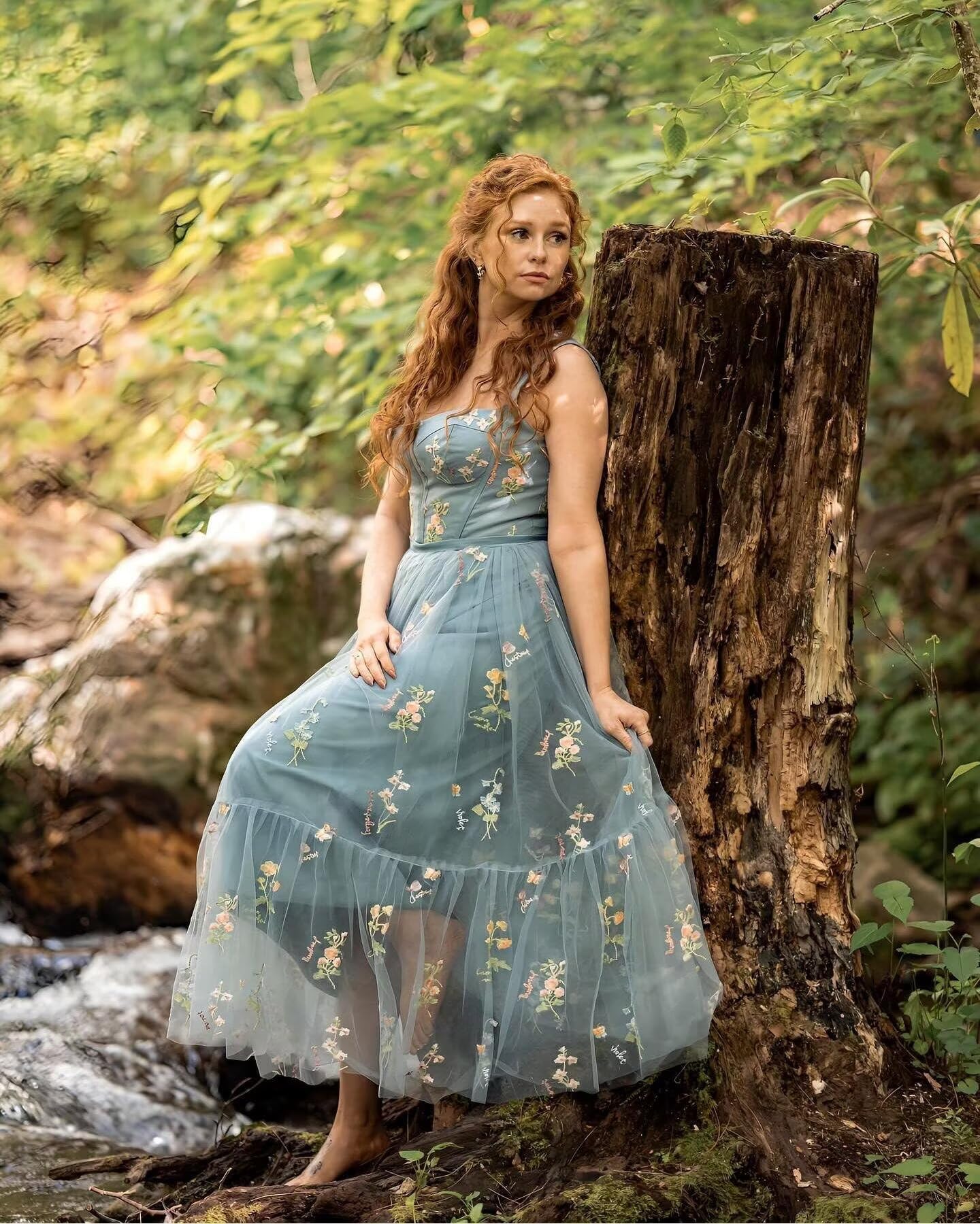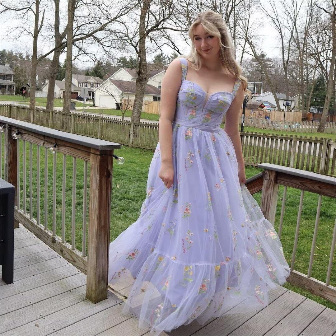 - Features: Tea Length Flower Pattern Embroidery Lace Sleeveless Empire Waist Sweetheart Neck Spaghetti Strap Tulle Prom Dress. Marvellous flower embroidery lace all over the fabric, wearing one of these Fivsole ball gowns, you would feel like being the fairy who calls on the rising of Spring sprouts~Lightweight, Breathable, Built-in bra, Adjustable Lace-Up Back.