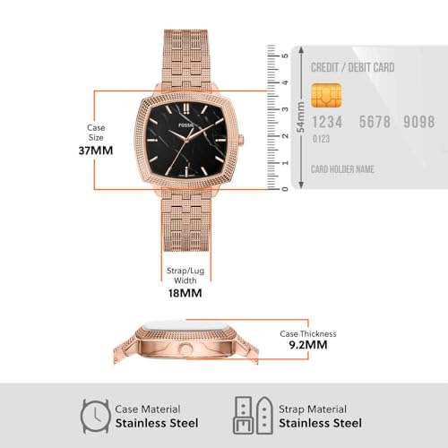 - Dial: Square rose gold stainless steel case, with a polished black dial.