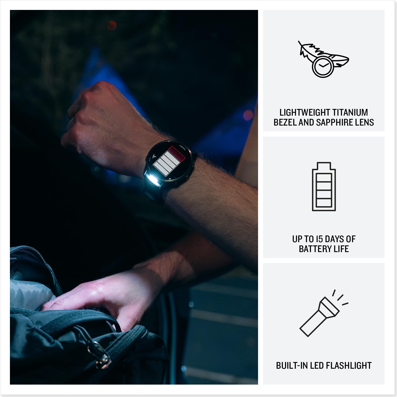 - Our brightest AMOLED touchscreen display with button controls, a lightweight titanium bezel and sapphire lens, plus a built-in LED flashlight for greater awareness in the dark during early morning or late-night runs