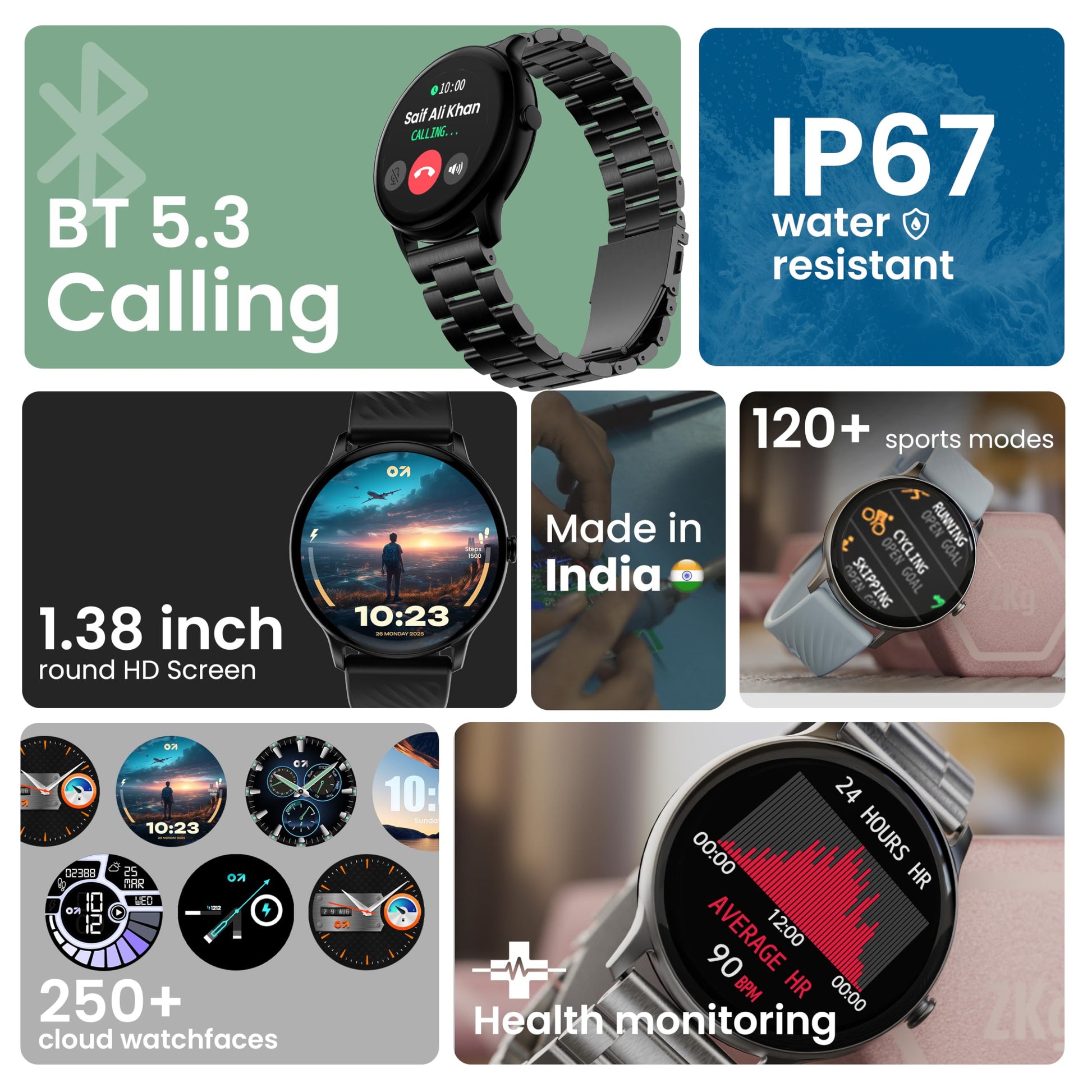 Details: Discover style and functionality combined in the Dire Smartwatch, available in Black (Silicon Strap), Jet Black (Stainless Steel), Silver (Stainless Steel), and Blue (Silicon Strap). Featuring a stunning 1.38'' round HD screen with 500 nits brightness and a sleek 2.5D curved glass, it offers unmatched clarity and sophistication. Stay on top of your health with 24x7 Heart Rate Monitoring, SpO2 Tracking, Blood Pressure Monitoring, Menstrual Cycle Tracking, and Stress and Sleep Analysis, along with hydration and sedentary reminders to keep you active and refreshed. Enjoy seamless connectivity with Bluetooth 5.3 calling, a dedicated speaker and mic, and AI voice assistants like Siri and Google Assistant for smarter productivity. With 120+ sports modes, 250+ customizable watch faces, camera controls, mini-games, and IP67 water resistance, the Dire Smartwatch adapts to your every need, making it the ultimate companion for fitness, productivity, and style.
