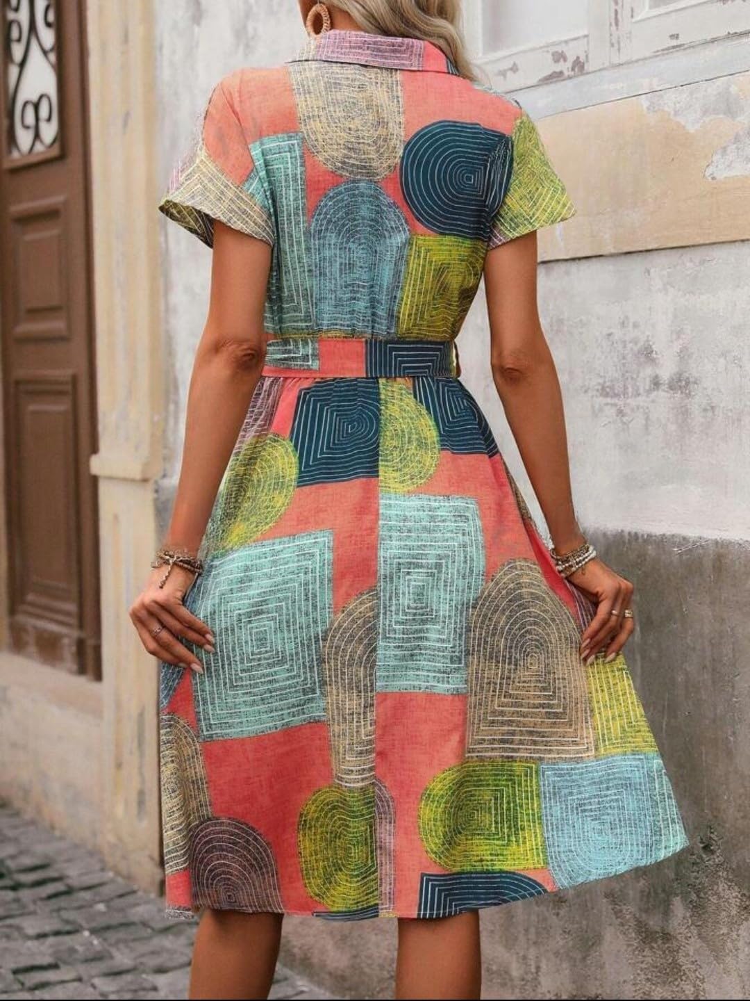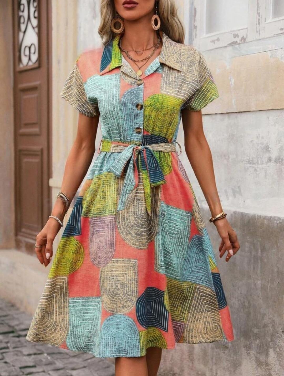 Gufrina Women's Short Sleeve Collar Neck Dress - Geometric Print Button-Down Midi Dress with Tie-Up Belt (in, Alpha, 5XL, Regular, Peach)