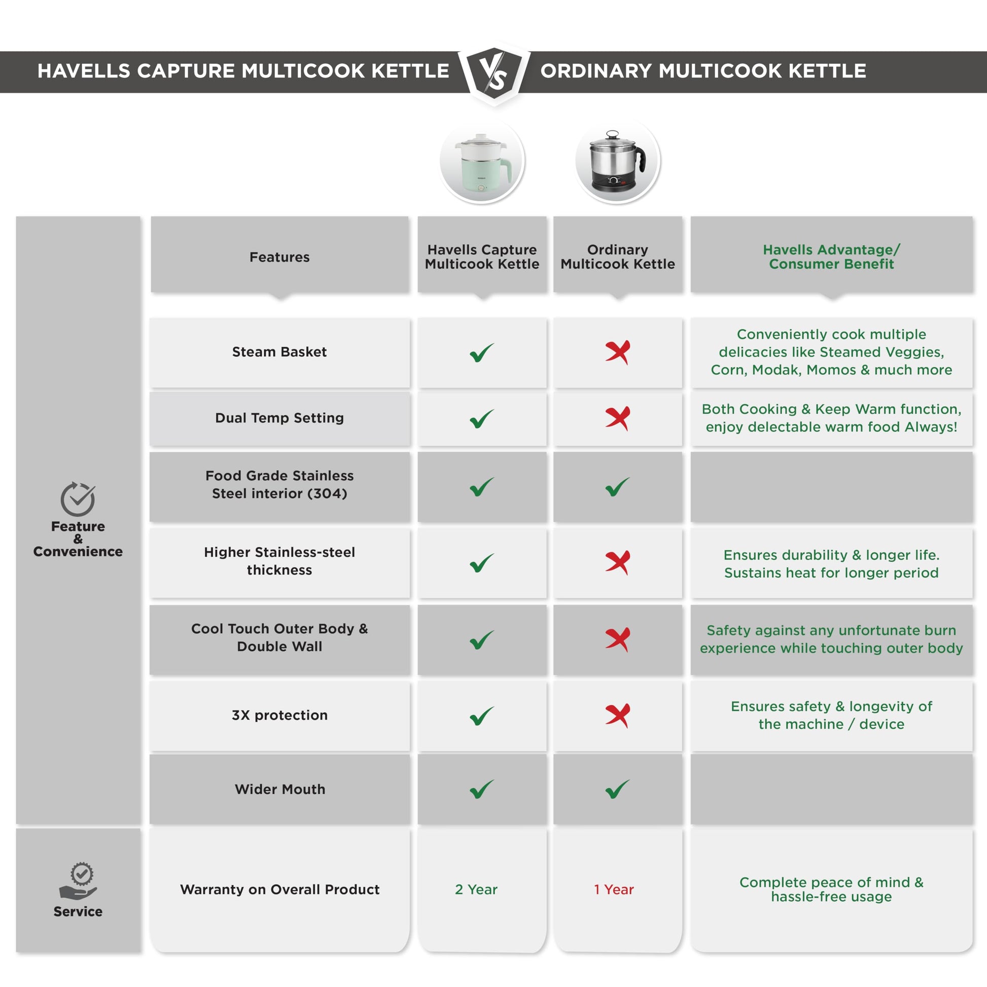 Havells Capture 1.2 L Multi-Cook Electric Kettle with Steamer | 650W |304 Stainless Steel Inner Body|Cooks Noodles, Rice, Milk | Cool-Touch Body | 2-Year Warranty (Green)