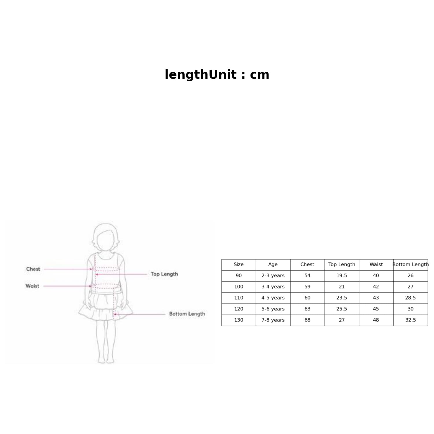 • All Dimensions are in cms :- Skirt set: Length: 32.5 cm , Chest: 68 cm , Waist: 50 cm , Length: 27 cm