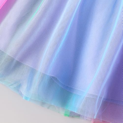 - Magical dress in pastel rainbow tulle with pretty floral bodice and dramatic purple bow sash detail. Adjustable shoulder straps and full layered skirt create a dreamy look perfect for twirling at celebrations.