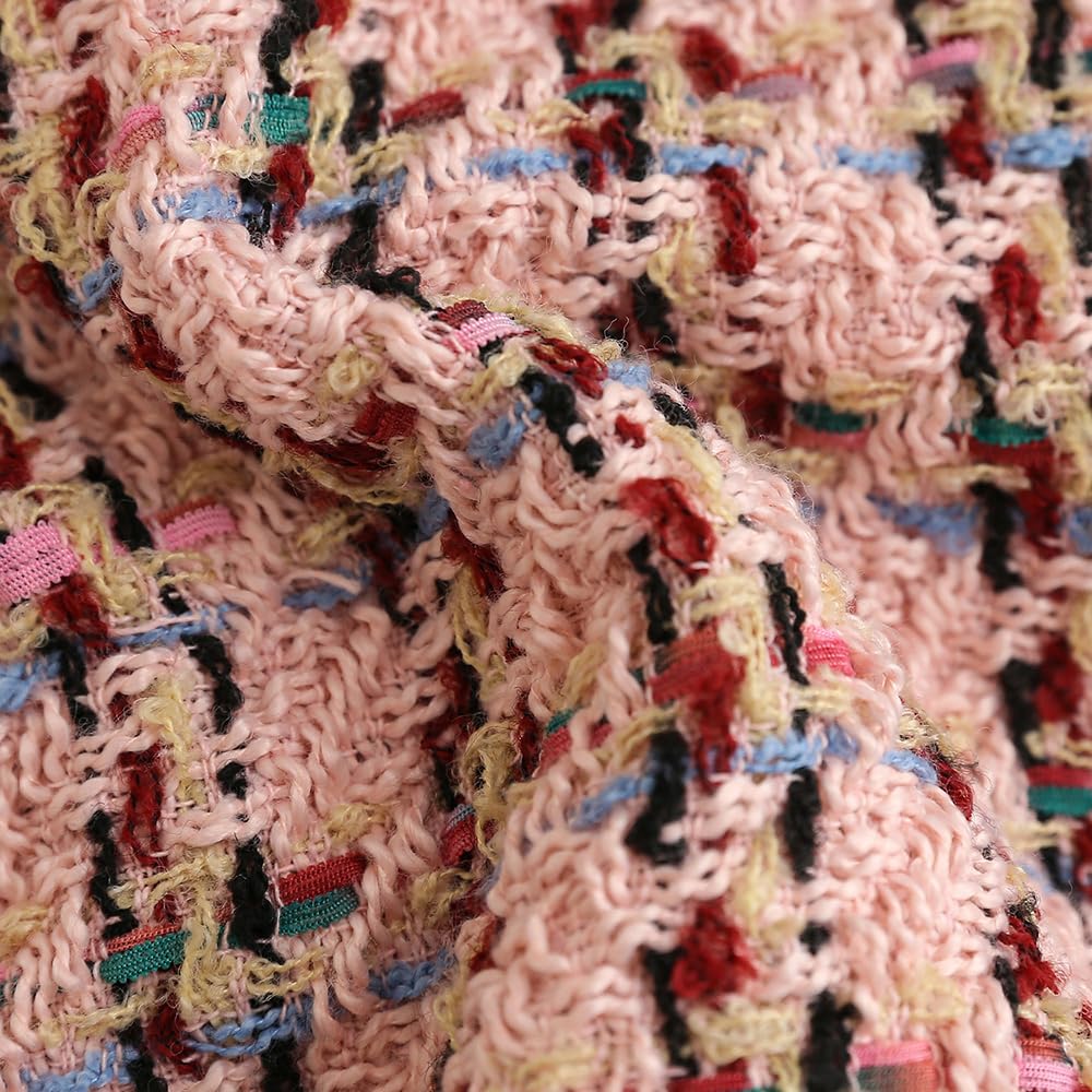 - Cozy meets chic in this pink jacket's unique blend of textures and colors. Soft sleeves meet tweed front panel, with sporty stripes at collar, cuffs, and hem. Button-up front adds effortless style. Perfect layering piece!