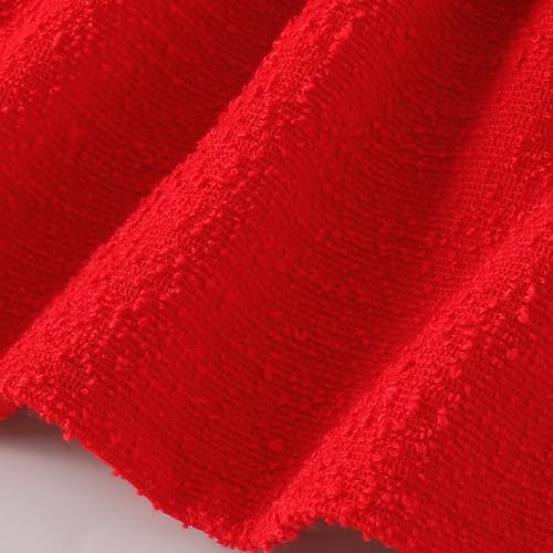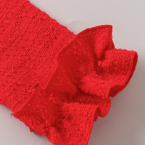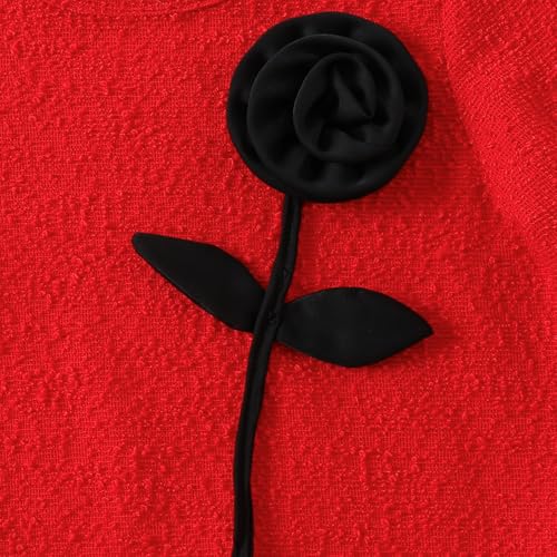 - Textured bouclé fabric and playful ruffle details frame an elegant stem-and-rose appliqué on a dress that balances sophistication with charming whimsy.