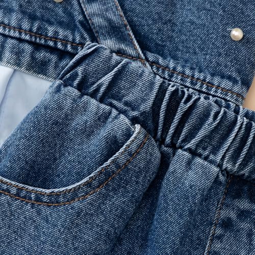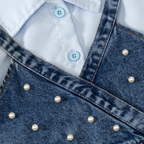 • Pearl embellishments meet puff sleeve sophistication in a charming denim-layered set that brings vintage-inspired elegance and playful preppy charm to special occasions.