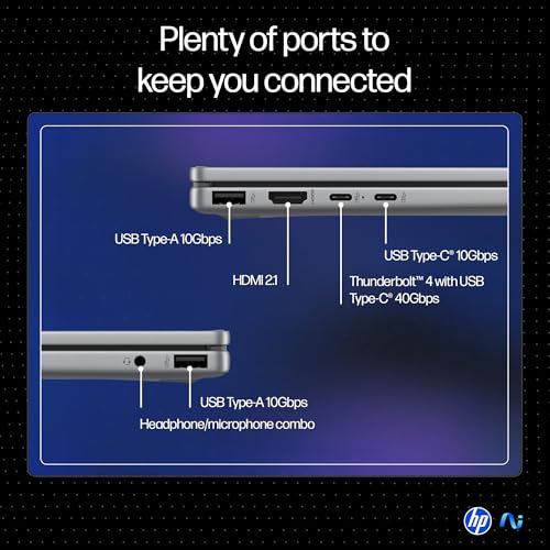 - Ports & Connectivity : 2 USB Type-A 10Gbps signaling rate; 1 HDMI 2.1; 1 headphone/microphone combo; 1 Thunderbolt 4 with USB Type-C 40Gbps signaling rate (USB Power Delivery, DisplayPort 2.1, HP Sleep and Charge); 1 USB Type-C 10Gbps signaling rate (USB Power Delivery, DisplayPort 1.4a, HP Sleep and Charge)| Connectivity: Intel Wi-Fi 7 BE201 (2x2) and Bluetooth 5.4 wireless card