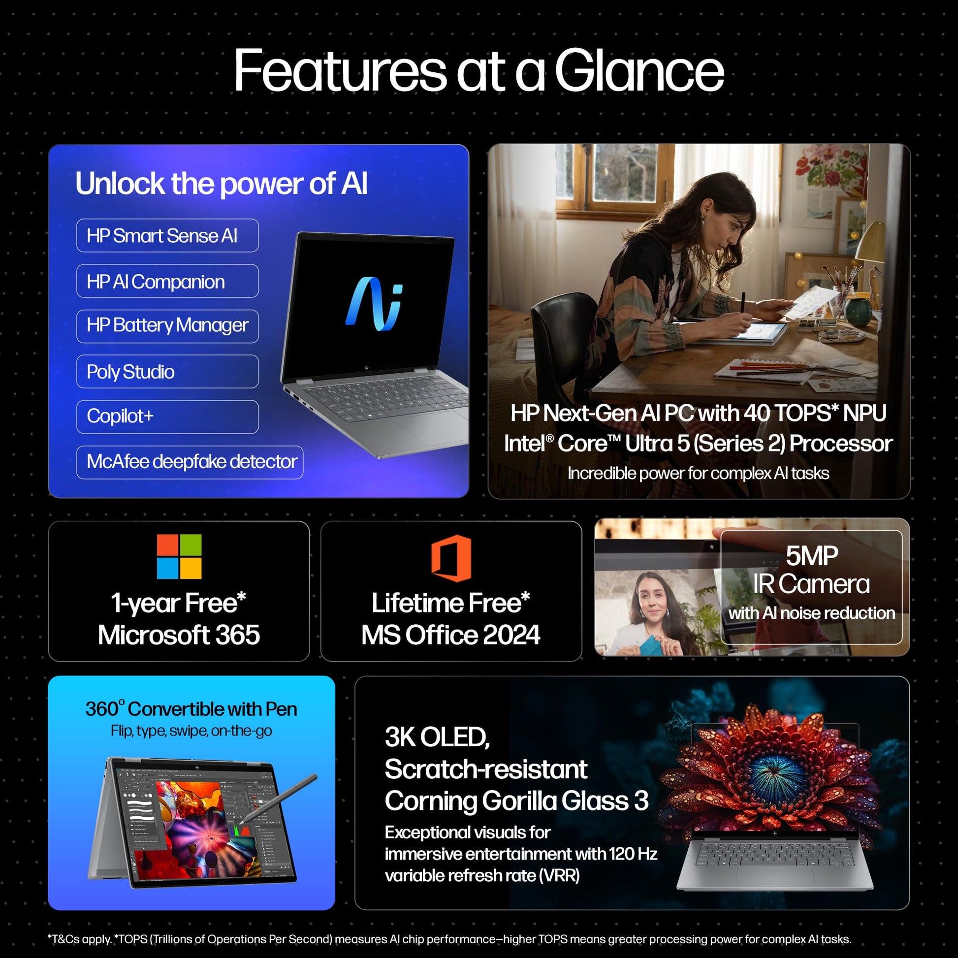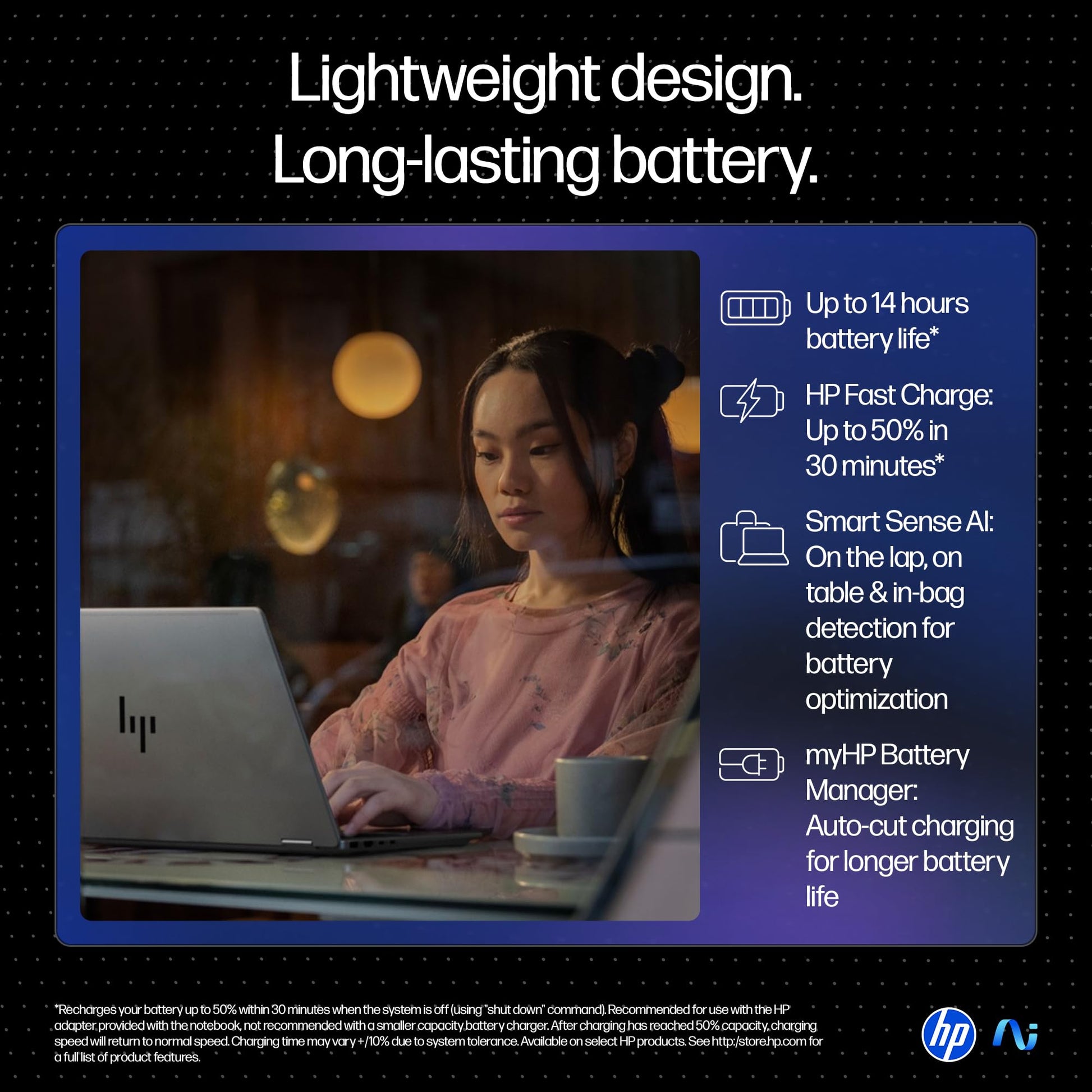 - Display & Graphics: 35.6 cm (14") diagonal, 3K (2880 x 1800), OLED, multitouch-enabled, 48- 120 Hz, 0.2 ms response time, UWVA, edge-to-edge glass, micro-edge, Corning Gorilla Glass 3, Low Blue Light, SDR 400 nits, HDR 500 nits, 100% DCI-P3| Graphics: Intel Arc 130V GPU (8GB)