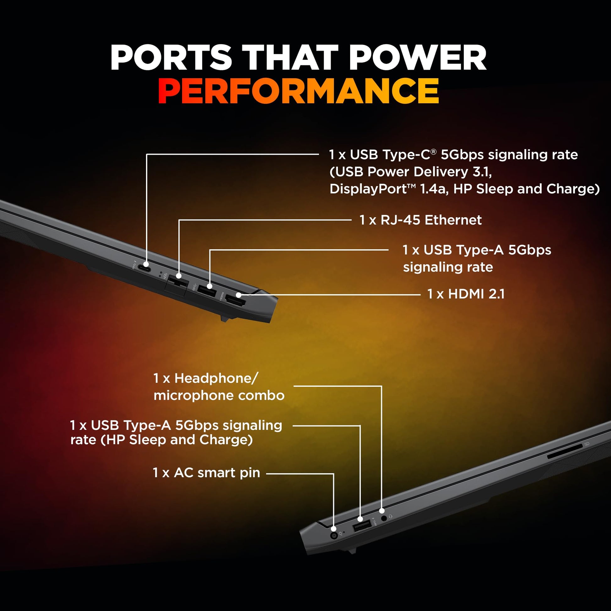 - Ports & Connectivity : 1 USB Type-A 5Gbps signaling rate (HP Sleep and Charge); 1 USB Type-A 5Gbps signaling rate; 1 AC smart pin; 1 HDMI-out 2.1; 1 headphone/microphone combo; 1 RJ-45; 1 USB Type-C 5Gbps signaling rate (USB Power Delivery 3.1, DisplayPort 1.4a, HP Sleep and Charge)| Wireless: Realtek Wi-Fi 6 (2x2) and Bluetooth 5.4 wireless card