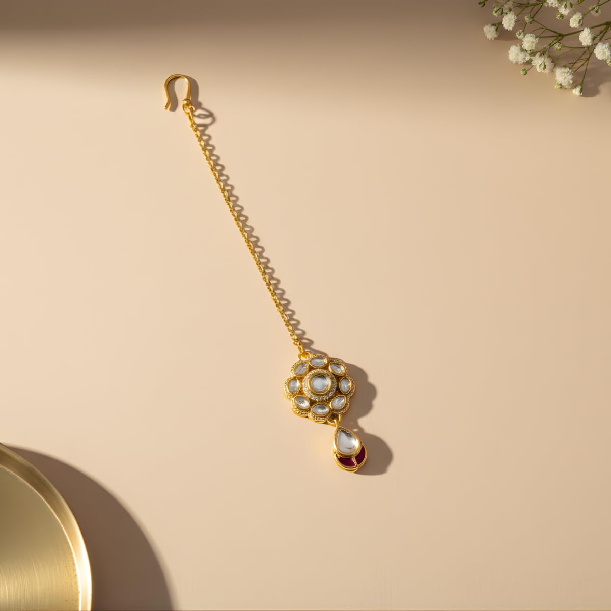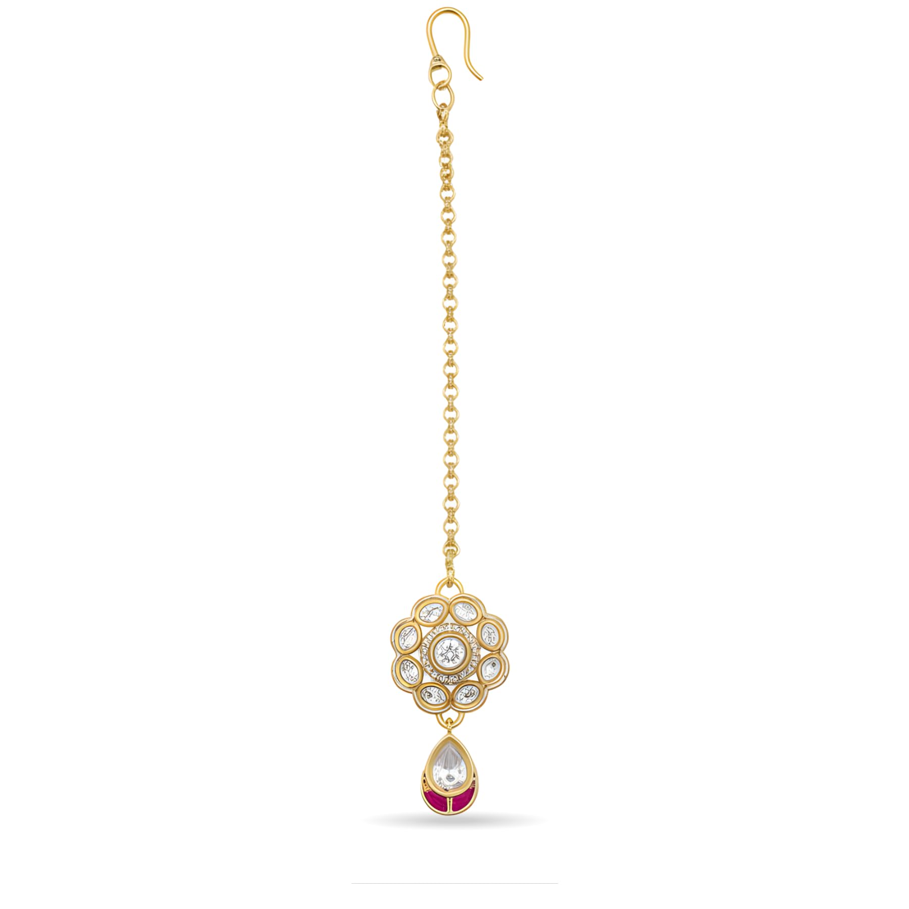 Elevate your traditional look with this beautifully crafted Kundan Maang Tikka – a timeless accessory designed to add grace and charm to your ethnic attire. Featuring a premium quality gold-plated finish, intricate Kundan work, and a stunning teardrop stone with a hint of pink enamel, this maang tikka is perfect for brides, bridesmaids, festive celebrations, and cultural occasions. The lightweight design ensures comfort for long hours, making it suitable for all-day wear.Whether styled with lehengas, sarees, or salwar suits, this elegant hair accessory instantly enhances your hairstyle and completes your festive or bridal ensemble. The secure hook ensures easy placement on the hair without discomfort. Add this versatile jewellery piece to your collection or gift it to someone who loves traditional Indian accessories.