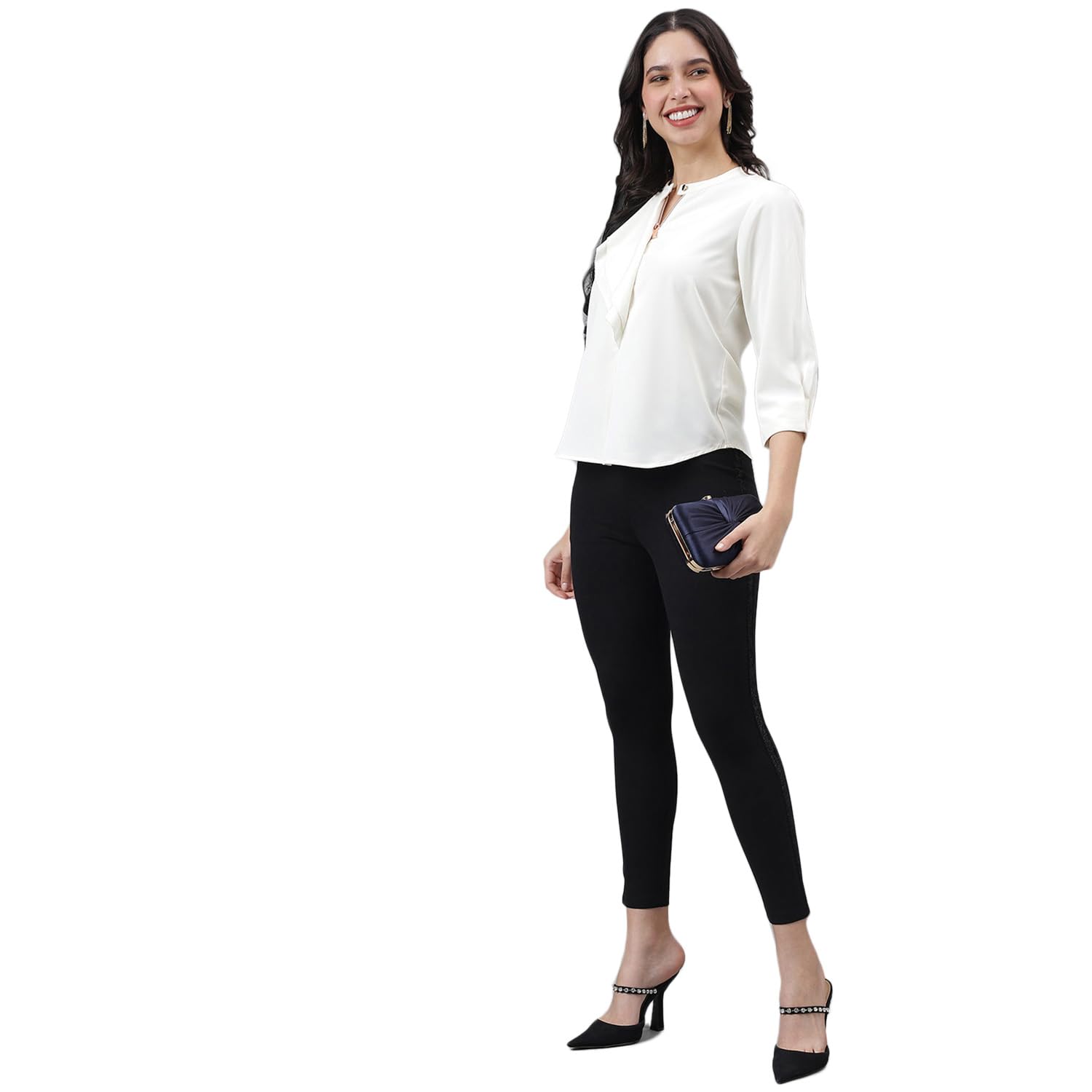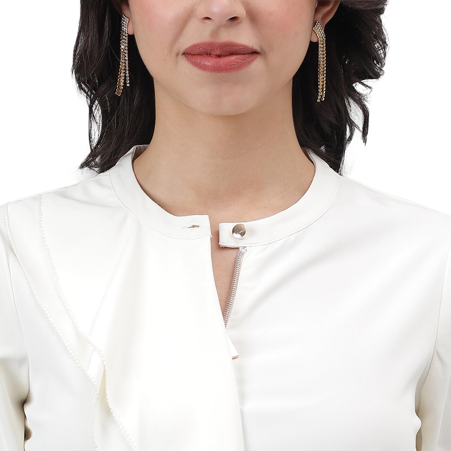 - Product Feature-: Material-: Polyester || Sleeves Type-: 3/4 Sleeve || Color-: Ivory || Pattern-: Solid || Closure Type-: Button || Neck Style-: Mandarin Neck
