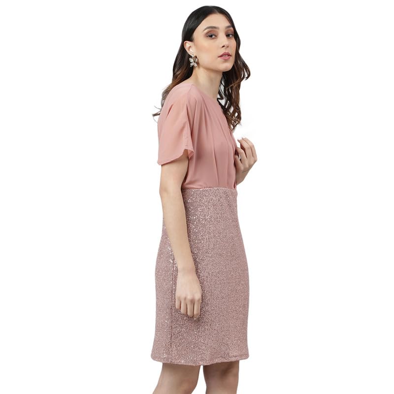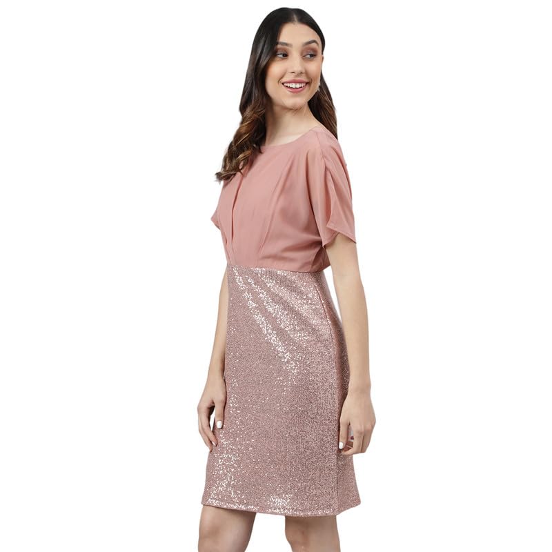 Latin Quarters Women's Pink Half Sleeves Embellished Short Dress_S
