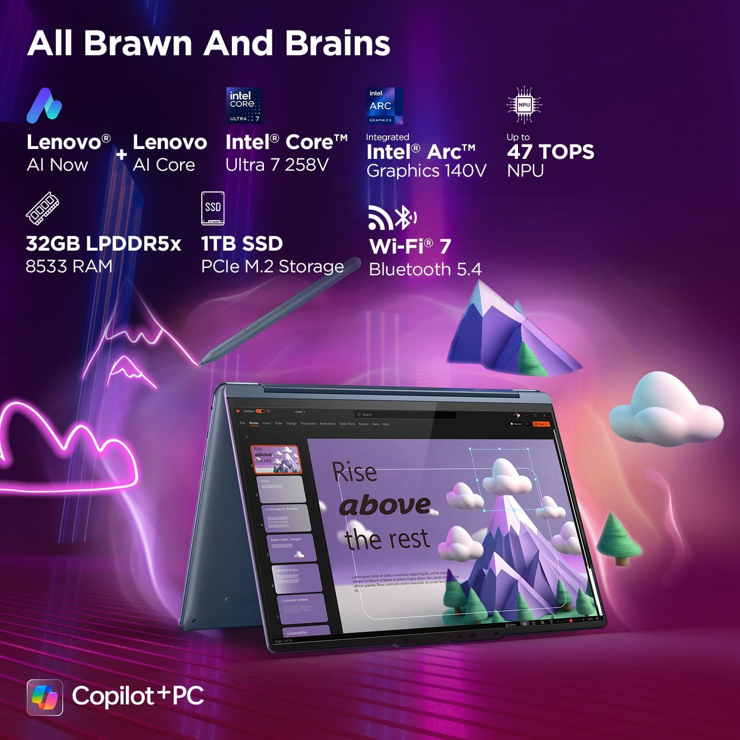 Lenovo Yoga 9 2-in-1 Aura Edition Intel Core Ultra 7 258V (32GB RAM/1TB SSD/14 (35.5cm)/4K WQUXGA OLED/47 Tops NPU/Copilot+PC/Windows 11/Office Home 2024+AI Now/Yoga Pen/Blue/1.3Kg), 83LC001FIN