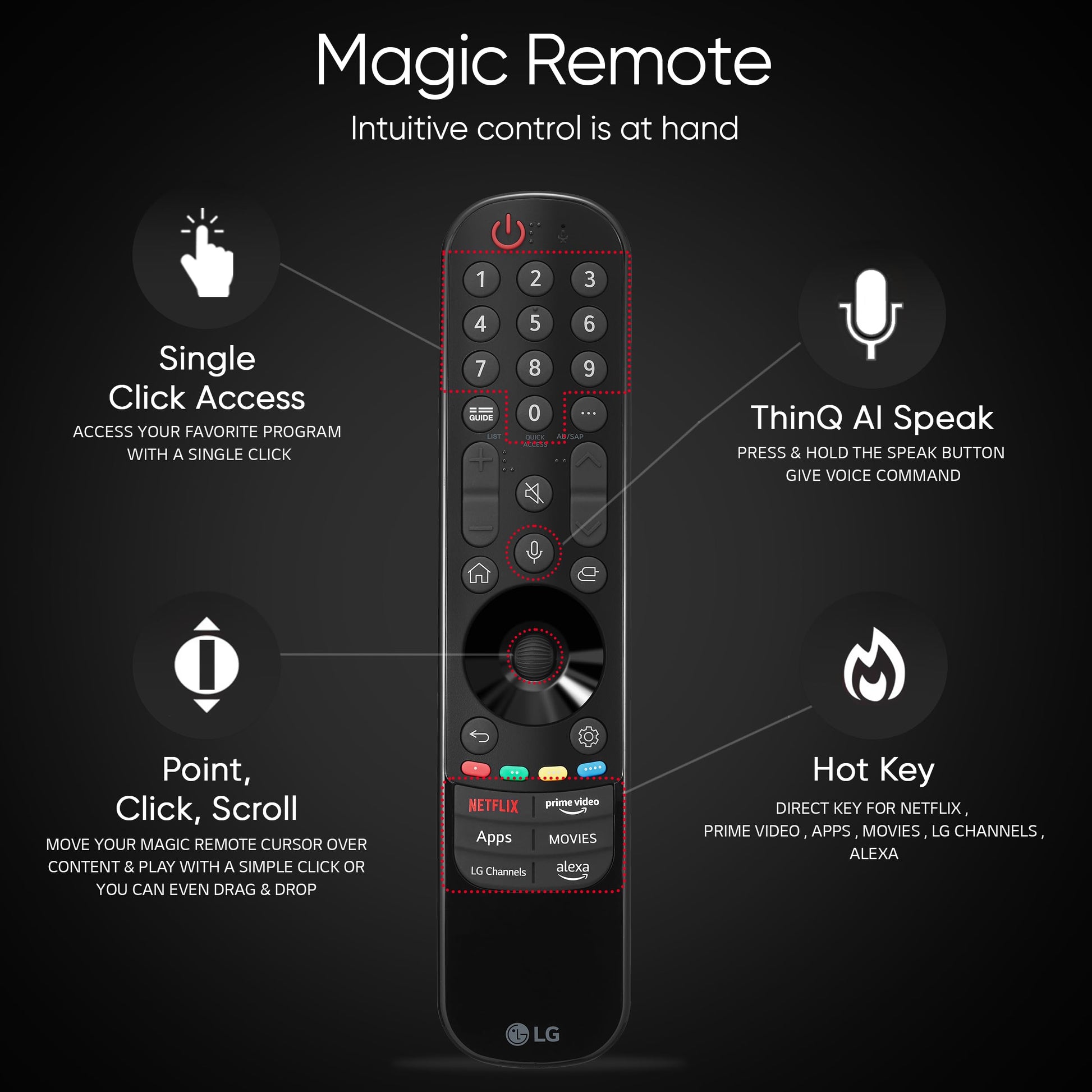 • Smart TV Features: α8 AI Processor | Web OS Operating System | Wi-Fi | Magic Remote | Full Web Browser | Built In Chromecast | Game Optimizer | AI Functions | Dynamic Tone Mapping Pro | HDR 10 | 2 GB RAM | 16 GB ROM | Supported Apps: Prime Video, Netflix, Jio Hotstar, Sony Liv, Zee5, Apple TV and more | Energy Rating: 3 Star | Annual Energy Consumption: 184.00 kWh/Year