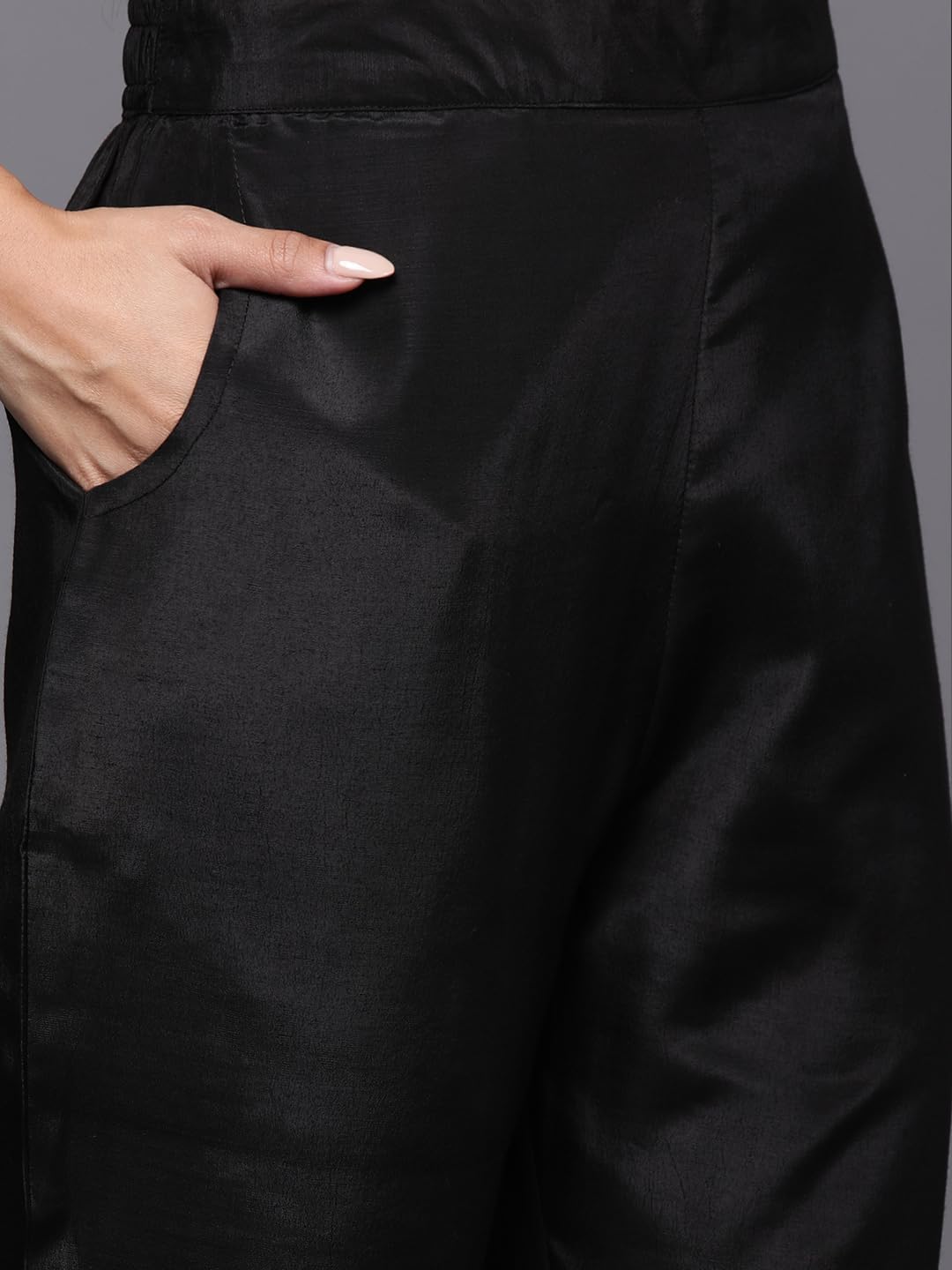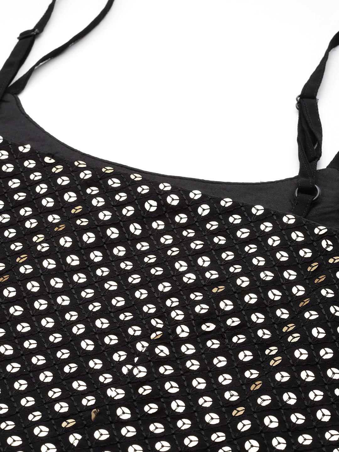 Our 3-piece black suit set, crafted in soft georgette fabric, features a sleeveless A-line kurta with a strappy neckline, a side zip closure, and a flared hemline. Complemented with straight-fit trousers with a partially elasticated waistband and roomy pockets, and a dupatta. Adorned with sequinned detailing and Gota Patti accents, this charming style is perfect for festive celebrations.