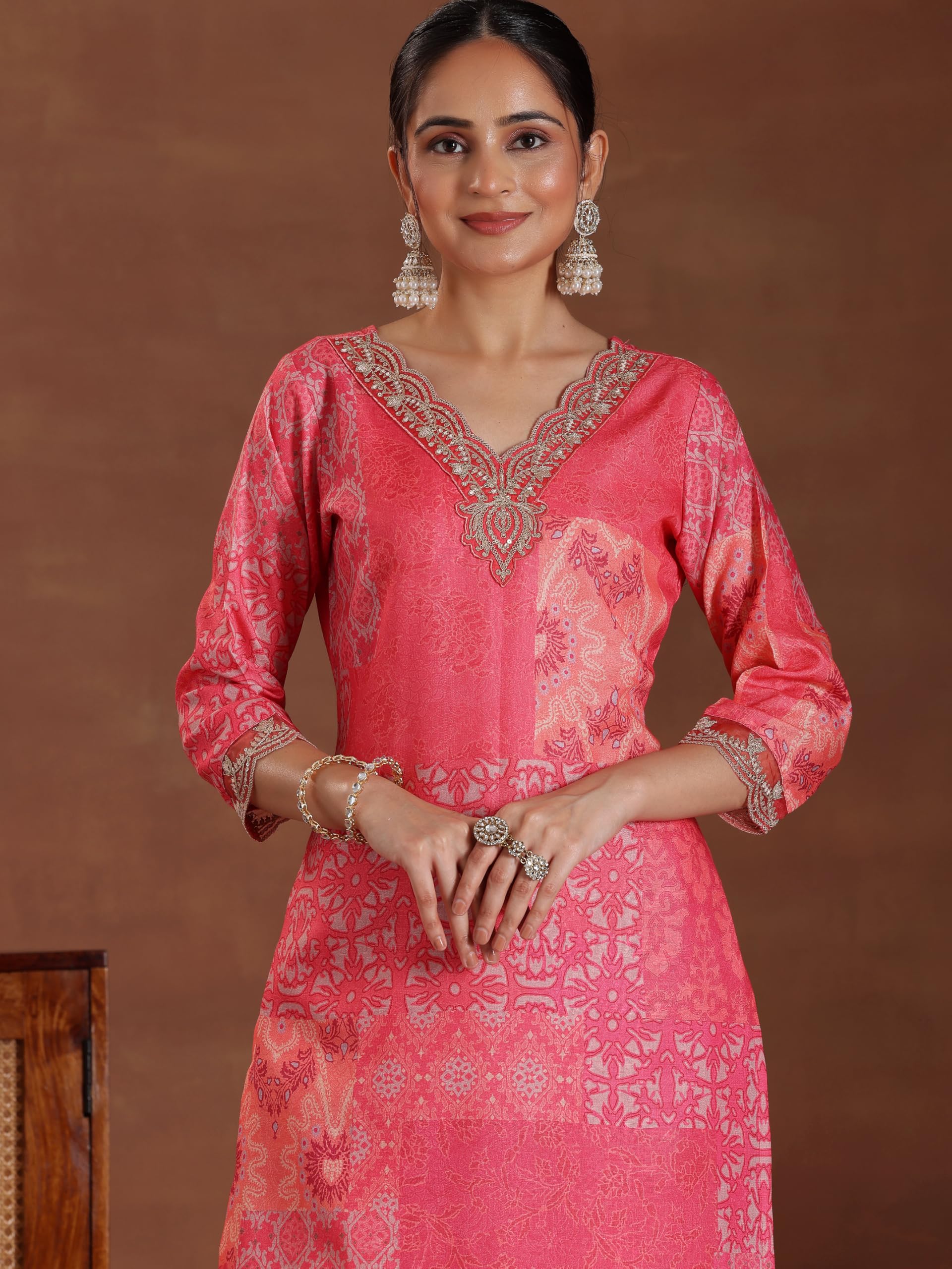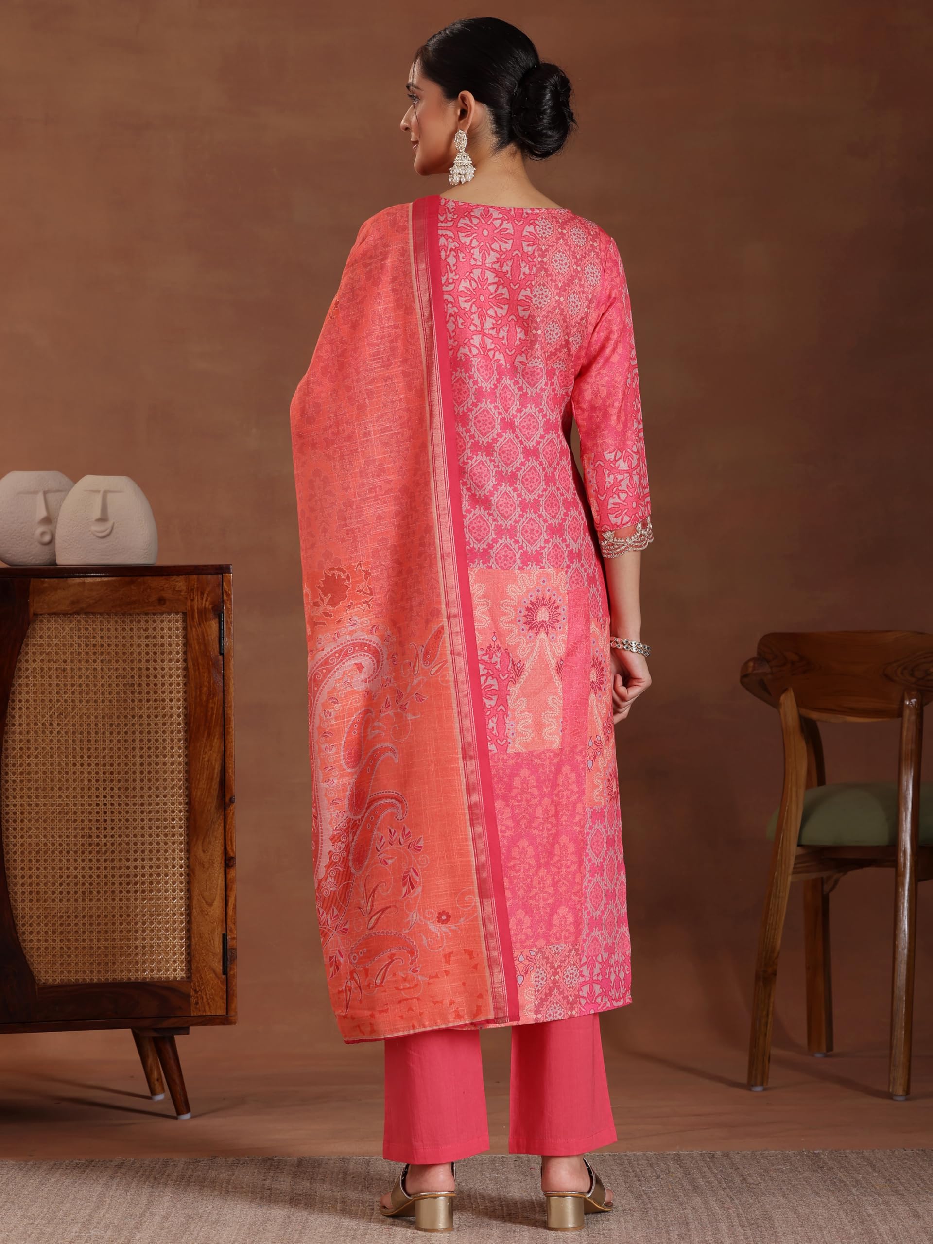 Pink, gold-toned and white printed kurta with trousers and dupatta